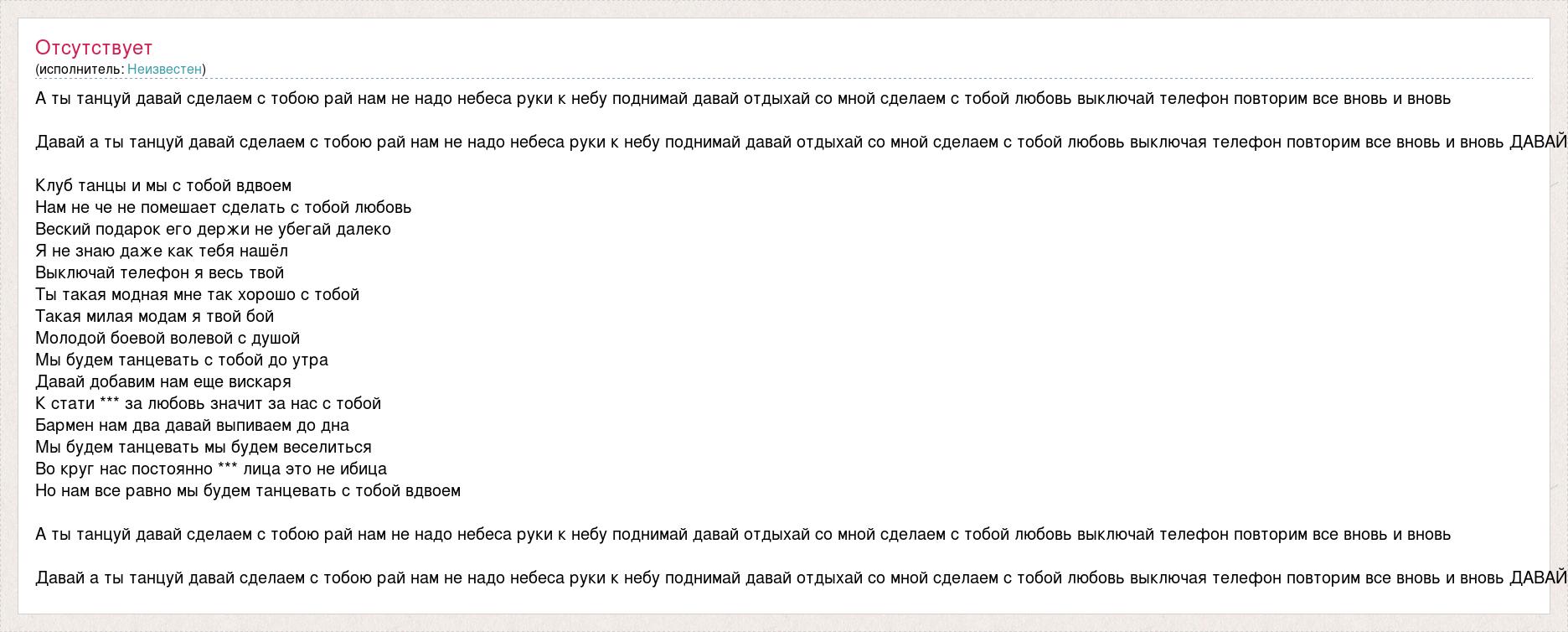 А ты танцуй давай сделаем с тобою рай нам не надо небеса руки к небу поднимай давай отдыхай со мной сделаем с тобой любовь выключай телефон повторим все вновь и вновь Давай а ты танцуй давай сделаем с тобою рай нам не надо небеса руки к небу поднимай давай отдыхай со мной сделаем с тобой любовь выключая телефон повторим все вновь и вновь ДАВАЙ Клуб танцы и мы с тобой вдвоем Нам не че не помешает сделать с тобой любовь Веский подарок его держи не убегай далеко Я не знаю даже как тебя нашёл Выключай телефон я весь твой Ты такая модная мне так хорошо с тобой Такая милая модам я твой бой Молодой боевой волевой с душой Мы будем танцевать с тобой до утра Давай добавим нам еще вискаря К стати *** за любовь значит за нас с тобой Бармен нам два давай выпиваем до дна Мы будем танцевать мы будем веселиться Во круг нас постоянно *** лица это не ибица Но нам все равно мы будем танцевать с тобой вдвоем А ты танцуй давай сделаем с тобою рай нам не надо небеса руки к небу поднимай давай отдыхай со мной сделаем с тобой любовь выключай телефон повторим все вновь и вновь Давай а ты танцуй давай сделаем с тобою рай нам не надо небеса руки к небу поднимай давай отдыхай со мной сделаем с тобой любовь выключая телефон повторим все вновь и вновь ДАВАЙ
