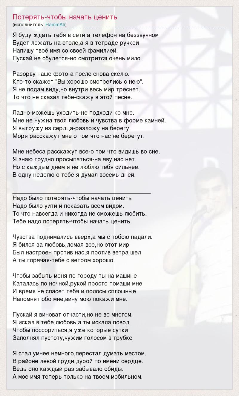 Я буду ждать тебя в сети а телефон на беззвучном Будет лежать на столе,а я в тетраде ручкой Напишу твоё имя со своей фамилией. Пускай не сбудется-но смотрится очень мило. Разорву наше фото-а после снова скелю. Кто-то скажет "Вы хорошо смотрелись с нею". Я не подам виду,но внутри весь мир треснет. То что не сказал тебе-скажу в этой песне. Ладно-можешь уходить-не подходи ко мне. Мне не нужна твоя любовь и чувства в форме камней. Я выгружу из сердца-разложу на берегу. Моря расскажут мне о том что нас не берегут. Мне небеса расскажут все-о том что видишь во сне. Я знаю трудно просыпаться-на яву нас нет. Но с каждым днем я не люблю тебя сильнее. В одну неделю о тебе я думал восемь дней. __________________________________________ Надо было потерять-чтобы начать ценить Надо было уйти и показать всем видом. То что навсегда и никогда не сможешь любить. Тебе надо потерять-чтобы начать ценить. __________________________________________ Чувства поднимались вверх,а мы с тобою падали. Я бился за любовь,ломая все,но этот мир Был настроен против нас,я против ветра шел А ты горячая-тебе с ветром хорошо. Чтобы забыть меня по городу ты на машине Каталась по ночной,рукой просто помаши мне И время не спасет тебя,и полосы сплошные Напомнят обо мне,вину мою покажи мне. Пускай я виноват отчасти,но не во многом. Я искал в тебе любовь,а ты искала повод Чтобы поссориться,я уже которые сутки Заполнял пустоту,чужим голосом в трубке Я стал умнее немного,перестал думать местом. В районе левой груди,дурой по имени сердце. Ведь оно каждый раз забывало обиды. А мое имя теперь только на твоем мобильном.