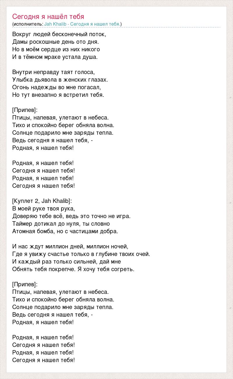 Вокруг людей бесконечный поток, Дамы роскошные день ото дня. Но в моём сердце из них никого И в тёмном мраке устала душа. Внутри неправду таят голоса, Улыбка дьявола в женских глазах. Огонь надежды во мне погасал, Но тут внезапно я встретил тебя. [Припев]: Птицы, напевая, улетают в небеса. Тихо и спокойно берег обняла волна. Солнце подарило мне заряды тепла. Ведь сегодня я нашел тебя, - Родная, я нашел тебя! Родная, я нашел тебя! Сегодня я нашел тебя! Родная, я нашел тебя! Сегодня я нашел тебя! [Куплет 2, Jah Khalib]: В моей руке твоя рука, Доверяю тебе всё, ведь это точно не игра. Таймер дотикал до нуля, ты словно Атомная бомба, но с частицами добра. И нас ждут миллион дней, миллион ночей, Где я увижу счастье только в глубине твоих очей. И каждый раз только сильней, дай мне Обнять тебя покрепче. Я хочу тебя согреть. [Припев]: Птицы, напевая, улетают в небеса. Тихо и спокойно берег обняла волна. Солнце подарило мне заряды тепла. Ведь сегодня я нашел тебя, - Родная, я нашел тебя! Родная, я нашел тебя! Сегодня я нашел тебя! Родная, я нашел тебя! Сегодня я нашел тебя!