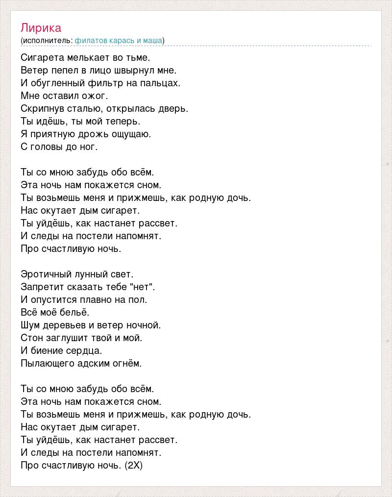 Сигарета мелькает во тьме. Ветер пепел в лицо швырнул мне. И обугленный фильтр на пальцах. Мне оставил ожог. Скрипнув сталью, открылась дверь. Ты идёшь, ты мой теперь. Я приятную дрожь ощущаю. С головы до ног. Ты со мною забудь обо всём. Эта ночь нам покажется сном. Ты возьмешь меня и прижмешь, как родную дочь. Нас окутает дым сигарет. Ты уйдёшь, как настанет рассвет. И следы на постели напомнят. Про счастливую ночь. Эротичный лунный свет. Запретит сказать тебе "нет". И опустится плавно на пол. Всё моё бельё. Шум деревьев и ветер ночной. Стон заглушит твой и мой. И биение сердца. Пылающего адским огнём. Ты со мною забудь обо всём. Эта ночь нам покажется сном. Ты возьмешь меня и прижмешь, как родную дочь. Нас окутает дым сигарет. Ты уйдёшь, как настанет рассвет. И следы на постели напомнят. Про счастливую ночь. (2X)