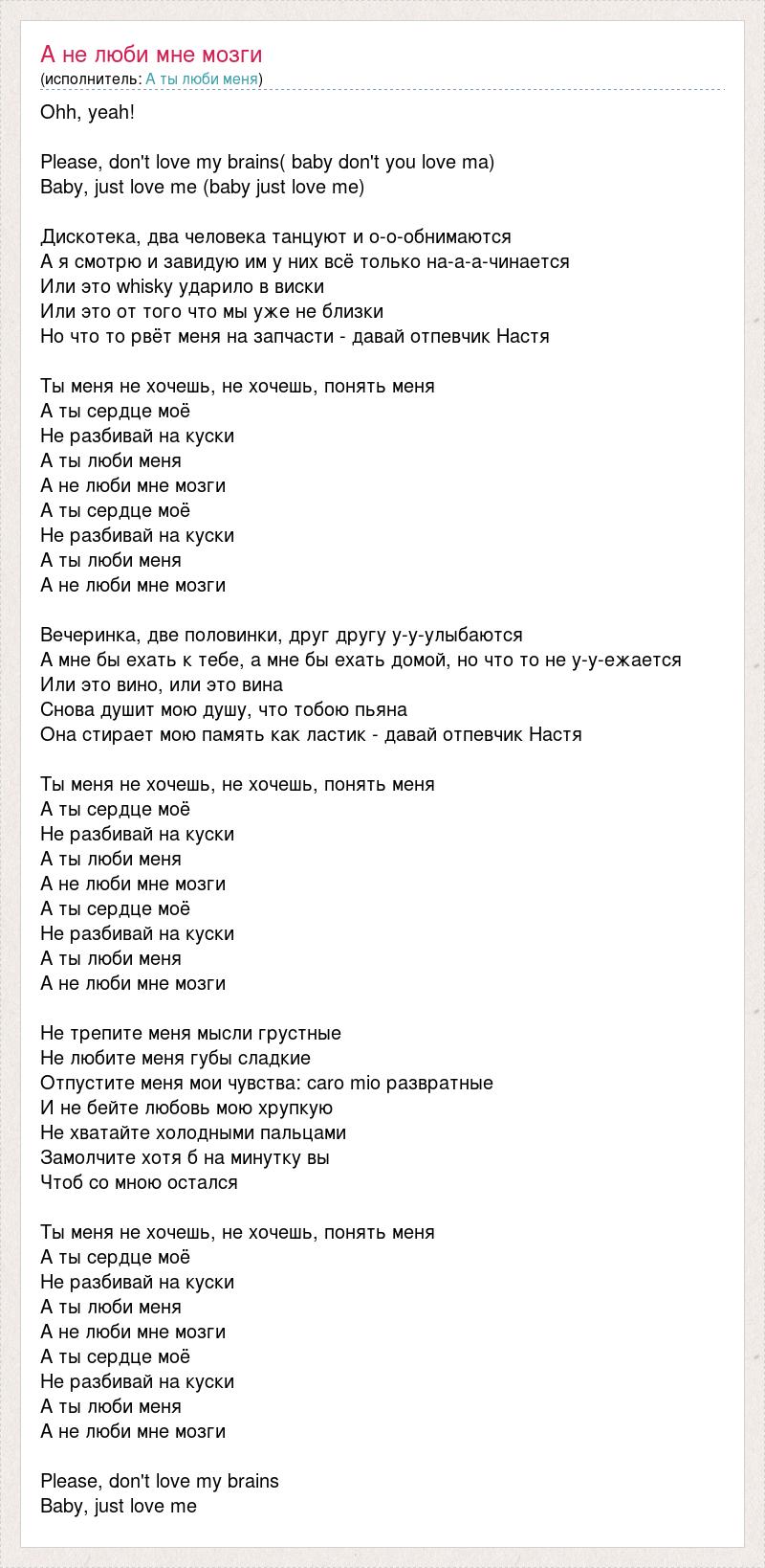 Ohh, yeah! Please, don't love my brains( baby don't you love ma) Baby, just love me (baby just love me) Дискотека, два человека танцуют и о-о-обнимаются А я смотрю и завидую им у них всё только на-а-а-чинается Или это whisky ударило в виски Или это от того что мы уже не близки Но что то рвёт меня на запчасти - давай отпевчик Настя Ты меня не хочешь, не хочешь, понять меня А ты сердце моё Не разбивай на куски А ты люби меня А не люби мне мозги А ты сердце моё Не разбивай на куски А ты люби меня А не люби мне мозги Вечеринка, две половинки, друг другу у-у-улыбаются А мне бы ехать к тебе, а мне бы ехать домой, но что то не у-у-ежается Или это вино, или это вина Снова душит мою душу, что тобою пьяна Она стирает мою память как ластик - давай отпевчик Настя Ты меня не хочешь, не хочешь, понять меня А ты сердце моё Не разбивай на куски А ты люби меня А не люби мне мозги А ты сердце моё Не разбивай на куски А ты люби меня А не люби мне мозги Не трепите меня мысли грустные Не любите меня губы сладкие Отпустите меня мои чувства: сaro mio развратные И не бейте любовь мою хрупкую Не хватайте холодными пальцами Замолчите хотя б на минутку вы Чтоб со мною остался Ты меня не хочешь, не хочешь, понять меня А ты сердце моё Не разбивай на куски А ты люби меня А не люби мне мозги А ты сердце моё Не разбивай на куски А ты люби меня А не люби мне мозги Please, don't love my brains Baby, just love me