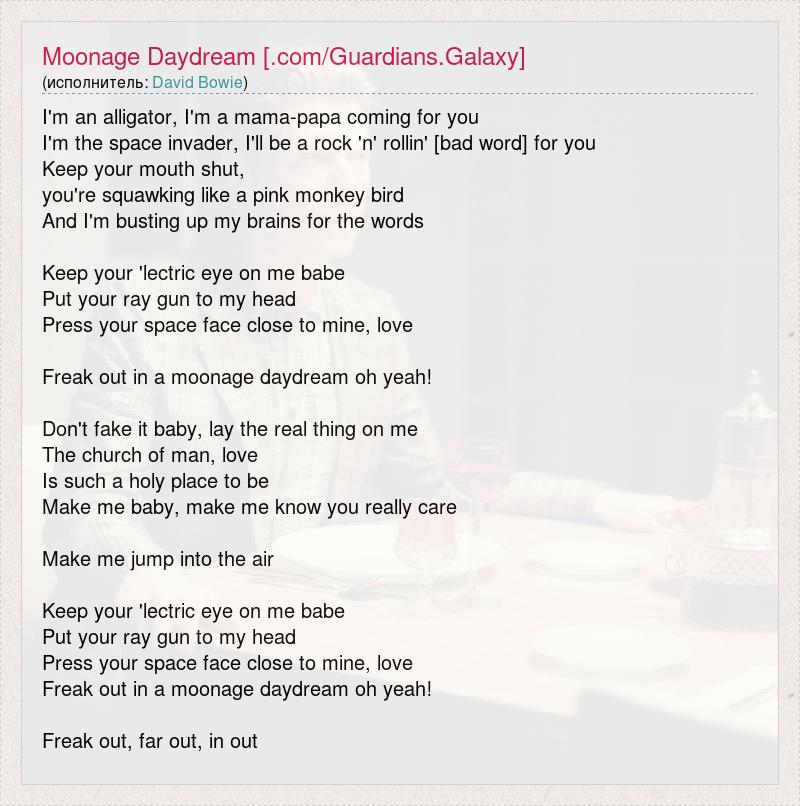 I'm an alligator, I'm a mama-papa coming for you I'm the space invader, I'll be a rock 'n' rollin' [bad word] for you Keep your mouth shut, you're squawking like a pink monkey bird And I'm busting up my brains for the words Keep your 'lectric eye on me babe Put your ray gun to my head Press your space face close to mine, love Freak out in a moonage daydream oh yeah! Don't fake it baby, lay the real thing on me The church of man, love Is such a holy place to be Make me baby, make me know you really care Make me jump into the air Keep your 'lectric eye on me babe Put your ray gun to my head Press your space face close to mine, love Freak out in a moonage daydream oh yeah! Freak out, far out, in out