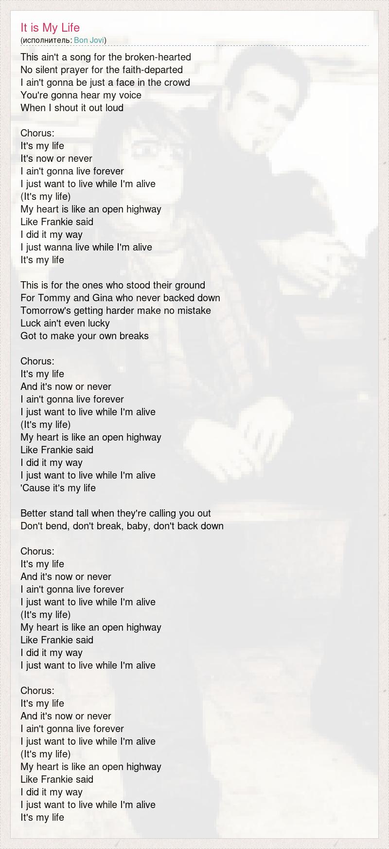 This ain't a song for the broken-hearted No silent prayer for the faith-departed I ain't gonna be just a face in the crowd You're gonna hear my voice When I shout it out loud Chorus: It's my life It's now or never I ain't gonna live forever I just want to live while I'm alive (It's my life) My heart is like an open highway Like Frankie said I did it my way I just wanna live while I'm alive It's my life This is for the ones who stood their ground For Tommy and Gina who never backed down Tomorrow's getting harder make no mistake Luck ain't even lucky Got to make your own breaks Chorus: It's my life And it's now or never I ain't gonna live forever I just want to live while I'm alive (It's my life) My heart is like an open highway Like Frankie said I did it my way I just want to live while I'm alive 'Cause it's my life Better stand tall when they're calling you out Don't bend, don't break, baby, don't back down Chorus: It's my life And it's now or never I ain't gonna live forever I just want to live while I'm alive (It's my life) My heart is like an open highway Like Frankie said I did it my way I just want to live while I'm alive Chorus: It's my life And it's now or never I ain't gonna live forever I just want to live while I'm alive (It's my life) My heart is like an open highway Like Frankie said I did it my way I just want to live while I'm alive It's my life