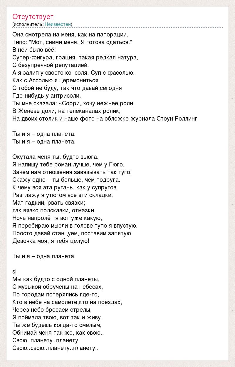Она смотрела на меня, как на папорации. Типо: "Мот, сними меня. Я готова сдаться." В ней было всё: Супер-фигура, грация, такая редкая натура, С безупречной репутацией. А я залип у своего консоля. Суп с фасолью. Как с Ассолью я церемониться С тобой не буду, так что давай сегодня Где-нибудь у антрисоли. Ты мне сказала: «Сорри, хочу нежнее роли, В Женеве доли, на телеканалах ролик, На двоих столик и наше фото на обложке журнала Стоун Роллинг Ты и я – одна планета. Ты и я – одна планета. Окутала меня ты, будто вьюга. Я напишу тебе роман лучше, чем у Гюго. Зачем нам отношения завязывать так туго, Скажу одно – ты больше, чем подруга. К чему вся эта ругань, как у супругов. Разглажу я утюгом все эти складки. Мат гадкий, рвать связки; так вязко подсказки, отмазки. Ночь напролёт я вот уже какую, Я перебираю мысли в голове тупо я впустую. Просто давай станцуем, поставим запятую. Девочка моя, я тебя целую! Ты и я – одна планета. si Мы как будто с одной планеты, С музыкой обручены на небесах, По городам потерялись где-то, Кто в небе на самолете,кто на поездах, Через небо бросаем стрелы, Я поймала твою, вот так и живу. Ты же будешь когда-то смелым, Обнимай меня так же, как свою.. Свою..планету..планету Свою..свою..планету..планету..