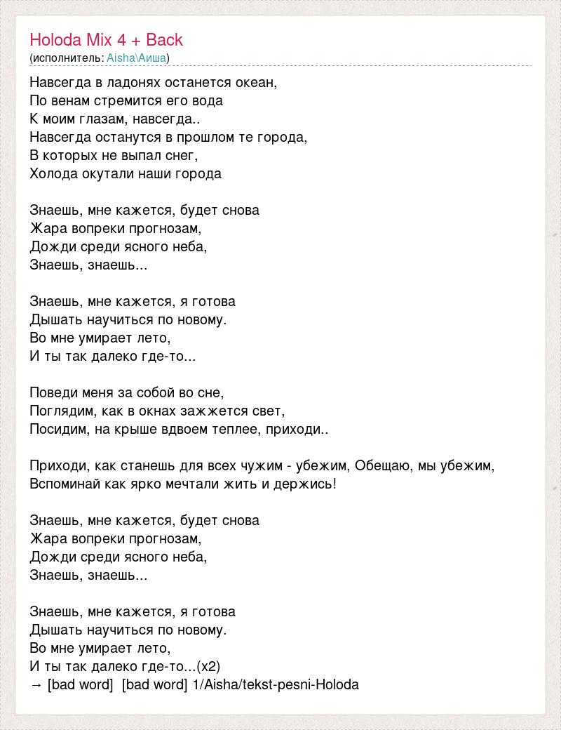 Навсегда в ладонях останется океан, По венам стремится его вода К моим глазам, навсегда.. Навсегда останутся в прошлом те города, В которых не выпал снег, Холода окутали наши города Знаешь, мне кажется, будет снова Жара вопреки прогнозам, Дожди среди ясного неба, Знаешь, знаешь... Знаешь, мне кажется, я готова Дышать научиться по новому. Во мне умирает лето, И ты так далеко где-то... Поведи меня за собой во сне, Поглядим, как в окнах зажжется свет, Посидим, на крыше вдвоем теплее, приходи.. Приходи, как станешь для всех чужим - убежим, Обещаю, мы убежим, Вспоминай как ярко мечтали жить и держись! Знаешь, мне кажется, будет снова Жара вопреки прогнозам, Дожди среди ясного неба, Знаешь, знаешь... Знаешь, мне кажется, я готова Дышать научиться по новому. Во мне умирает лето, И ты так далеко где-то...(х2) → [bad word] [bad word] 1/Aisha/tekst-pesni-Holoda
