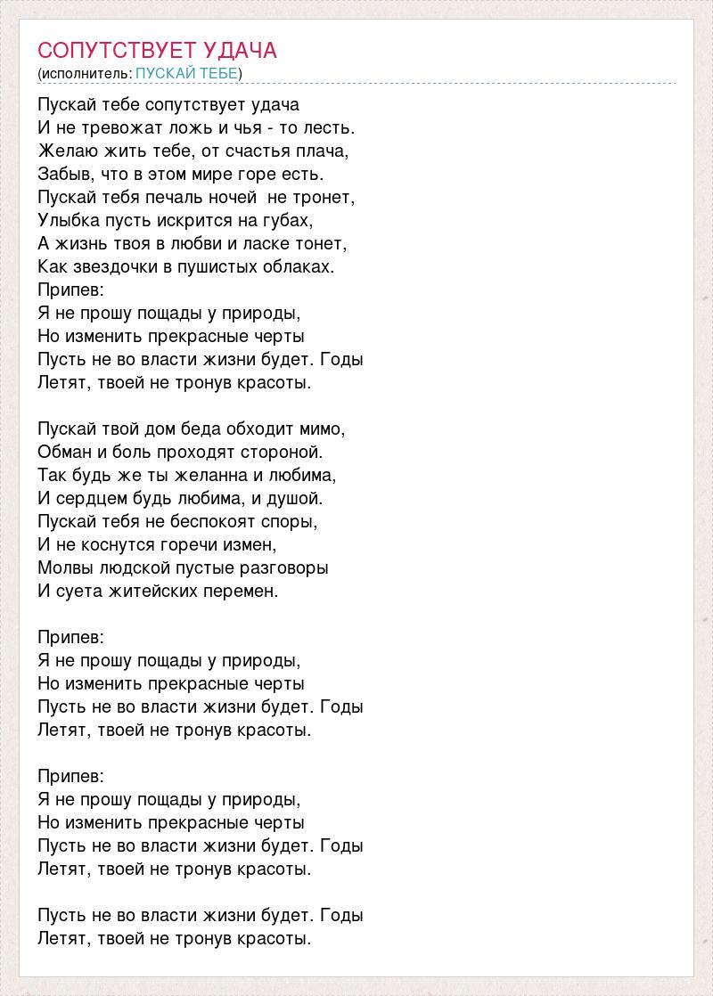 Пускай тебе сопутствует удача И не тревожат ложь и чья - то лесть. Желаю жить тебе, от счастья плача, Забыв, что в этом мире горе есть. Пускай тебя печаль ночей не тронет, Улыбка пусть искрится на губах, А жизнь твоя в любви и ласке тонет, Как звездочки в пушистых облаках. Припев: Я не прошу пощады у природы, Но изменить прекрасные черты Пусть не во власти жизни будет. Годы Летят, твоей не тронув красоты. Пускай твой дом беда обходит мимо, Обман и боль проходят стороной. Так будь же ты желанна и любима, И сердцем будь любима, и душой. Пускай тебя не беспокоят споры, И не коснутся горечи измен, Молвы людской пустые разговоры И суета житейских перемен. Припев: Я не прошу пощады у природы, Но изменить прекрасные черты Пусть не во власти жизни будет. Годы Летят, твоей не тронув красоты. Припев: Я не прошу пощады у природы, Но изменить прекрасные черты Пусть не во власти жизни будет. Годы Летят, твоей не тронув красоты. Пусть не во власти жизни будет. Годы Летят, твоей не тронув красоты.