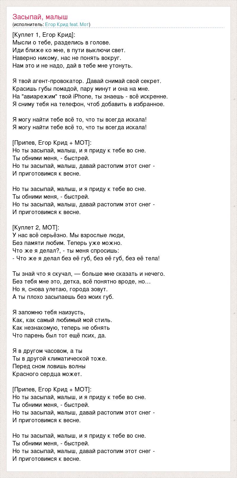 [Куплет 1, Егор Крид]: Мысли о тебе разделись в голове. Иди ближе ко мне, и по пути выключи свет. Наверно никому нас не понять вокруг. Нам это и не надо, дай в тебе мне утонуть. Я твой агент-провокатор. Давай, снимай свой секрет. Красишь губы помадой, пару минут и она на мне. На "авиарежим" твой iPhone, ты знаешь - всё искренне. Я сниму тебя на телефон, чтоб добавить в избранное. Помогу найти тебе всё то, что ты с другим теряла! Помогу найти тебе всё то, что ты всегда искала! [Припев, Егор Крид + МОТ]: Но ты засыпай, малыш, и я приду к тебе во сне. Ты обними меня, - быстрей. Но ты засыпай, малыш, давай растопим этот снег - И приготовимся к весне. Но ты засыпай, малыш, и я приду к тебе во сне. Ты обними меня, - быстрей. Но ты засыпай, малыш, давай растопим этот снег - И приготовимся к весне. [Куплет 2, МОТ]: Давай щас по фактам, давай щас серьёзно; Мы взрослые люди, без памяти любим, теперь уже можно. Что же я делал?, - ты меня спросишь: - Что же я делал без её рук, без её губ, без её тела, без её... Сказать, что я скучал - вообще не сказать ни-ничего. Без тебя мне это, детка, всё понятно вроде, но… Но я, снова улетаю, города зовут. А ты плохо засыпаешь без моих губ. Я запомню тебя наизусть, Как, как самый любимый мой стиль. Пусть знакомые тебе твердят, пусть, Что парень был тот ещё псих, да. Я в другом часовом, а ты Ты в другой климатической тоже. Перед сном ловишь мой В виде красного сердца emoji. [Припев, Егор Крид + МОТ]: Но ты засыпай, малыш, и я приду к тебе во сне. Ты обними меня, - быстрей. Но ты засыпай, малыш, давай растопим этот снег - И приготовимся к весне. Но ты засыпай, малыш, и я приду к тебе во сне. Ты обними меня, - быстрей. Но ты засыпай, малыш, давай растопим этот снег - И приготовимся к весне.