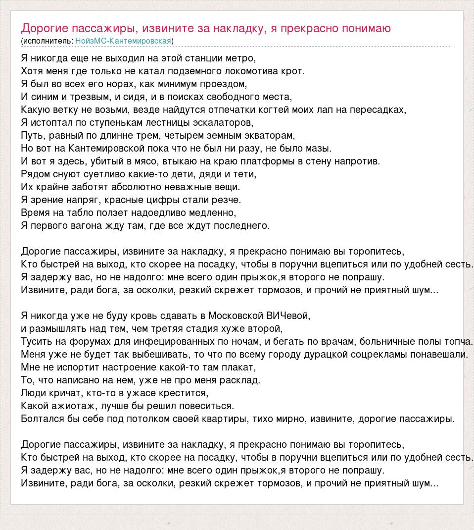 Я никогда еще не выходил на этой станции метро, Хотя меня где только не катал подземного локомотива крот. Я был во всех его норах, как минимум проездом, И синим и трезвым, и сидя, и в поисках свободного места, Какую ветку не возьми, везде найдутся отпечатки когтей моих лап на пересадках, Я истоптал по ступенькам лестницы эскалаторов, Путь, равный по длинне трем, четырем земным экваторам, Но вот на Кантемировской пока что не был ни разу, не было мазы. И вот я здесь, убитый в мясо, втыкаю на краю платформы в стену напротив. Рядом снуют суетливо какие-то дети, дяди и тети, Их крайне заботят абсолютно неважные вещи. Я зрение напряг, красные цифры стали резче. Время на табло ползет надоедливо медленно, Я первого вагона жду там, где все ждут последнего. Дорогие пассажиры, извините за накладку, я прекрасно понимаю вы торопитесь, Кто быстрей на выход, кто скорее на посадку, чтобы в поручни вцепиться или по удобней сесть. Я задержу вас, но не надолго: мне всего один прыжок,я второго не попрашу. Извините, ради бога, за осколки, резкий скрежет тормозов, и прочий не приятный шум... Я никогда уже не буду кровь сдавать в Московской ВИЧевой, и размышлять над тем, чем третяя стадия хуже второй, Тусить на форумах для инфецированных по ночам, и бегать по врачам, больничные полы топча. Меня уже не будет так выбешивать, то что по всему городу дурацкой соцрекламы понавешали. Мне не испортит настроение какой-то там плакат, То, что написано на нем, уже не про меня расклад. Люди кричат, кто-то в ужасе крестится, Какой ажиотаж, лучше бы решил повеситься. Болтался бы себе под потолком своей квартиры, тихо мирно, извините, дорогие пассажиры. Дорогие пассажиры, извините за накладку, я прекрасно понимаю вы торопитесь, Кто быстрей на выход, кто скорее на посадку, чтобы в поручни вцепиться или по удобней сесть. Я задержу вас, но не надолго: мне всего один прыжок,я второго не попрашу. Извините, ради бога, за осколки, резкий скрежет тормозов, и прочий не приятный шум...