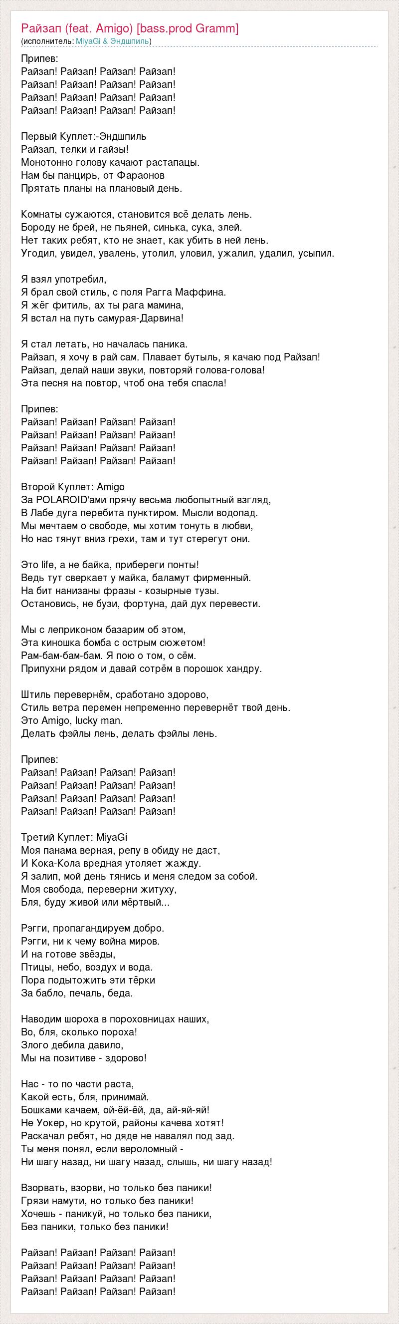 Припев: Райзап! Райзап! Райзап! Райзап! Райзап! Райзап! Райзап! Райзап! Райзап! Райзап! Райзап! Райзап! Райзап! Райзап! Райзап! Райзап! Первый Куплет:-Эндшпиль Райзап, телки и гайзы! Монотонно голову качают растапацы. Нам бы панцирь, от Фараонов Прятать планы на плановый день. Комнаты сужаются, становится всё делать лень. Бороду не брей, не пьяней, синька, сука, злей. Нет таких ребят, кто не знает, как убить в ней лень. Угодил, увидел, увалень, утолил, уловил, ужалил, удалил, усыпил. Я взял употребил, Я брал свой стиль, с поля Рагга Маффина. Я жёг фитиль, ах ты рага мамина, Я встал на путь самурая-Дарвина! Я стал летать, но началась паника. Райзап, я хочу в рай сам. Плавает бутыль, я качаю под Райзап! Райзап, делай наши звуки, повторяй голова-голова! Эта песня на повтор, чтоб она тебя спасла! Припев: Райзап! Райзап! Райзап! Райзап! Райзап! Райзап! Райзап! Райзап! Райзап! Райзап! Райзап! Райзап! Райзап! Райзап! Райзап! Райзап! Второй Куплет: Amigo За POLAROID'ами прячу весьма любопытный взгляд, В Лабе дуга перебита пунктиром. Мысли водопад. Мы мечтаем о свободе, мы хотим тонуть в любви, Но нас тянут вниз грехи, там и тут стерегут они. Это life, а не байка, прибереги понты! Ведь тут сверкает у майка, баламут фирменный. На бит нанизаны фразы - козырные тузы. Остановись, не бузи, фортуна, дай дух перевести. Мы с леприконом базарим об этом, Эта киношка бомба с острым сюжетом! Рам-бам-бам-бам. Я пою о том, о сём. Припухни рядом и давай сотрём в порошок хандру. Штиль перевернём, сработано здорово, Стиль ветра перемен непременно перевернёт твой день. Это Amigo, lucky man. Делать фэйлы лень, делать фэйлы лень. Припев: Райзап! Райзап! Райзап! Райзап! Райзап! Райзап! Райзап! Райзап! Райзап! Райзап! Райзап! Райзап! Райзап! Райзап! Райзап! Райзап! Третий Куплет: MiyaGi Моя панама верная, репу в обиду не даст, И Кока-Кола вредная утоляет жажду. Я залип, мой день тянись и меня следом за собой. Моя свобода, переверни житуху, Бля, буду живой или мёртвый... Рэгги, пропагандируем добро. Рэгги, ни к чему война миров. И на готове звёзды, Птицы, небо, воздух и вода. Пора подытожить эти тёрки За бабло, печаль, беда. Наводим шороха в пороховницах наших, Во, бля, сколько пороха! Злого дебила давило, Мы на позитиве - здорово! Нас - то по части раста, Какой есть, бля, принимай. Бошками качаем, ой-ёй-ёй, да, ай-яй-яй! Не Уокер, но крутой, районы качева хотят! Раскачал ребят, но дяде не навалял под зад. Ты меня понял, если вероломный - Ни шагу назад, ни шагу назад, слышь, ни шагу назад! Взорвать, взорви, но только без паники! Грязи намути, но только без паники! Хочешь - паникуй, но только без паники, Без паники, только без паники! Райзап! Райзап! Райзап! Райзап! Райзап! Райзап! Райзап! Райзап! Райзап! Райзап! Райзап! Райзап! Райзап! Райзап! Райзап! Райзап!