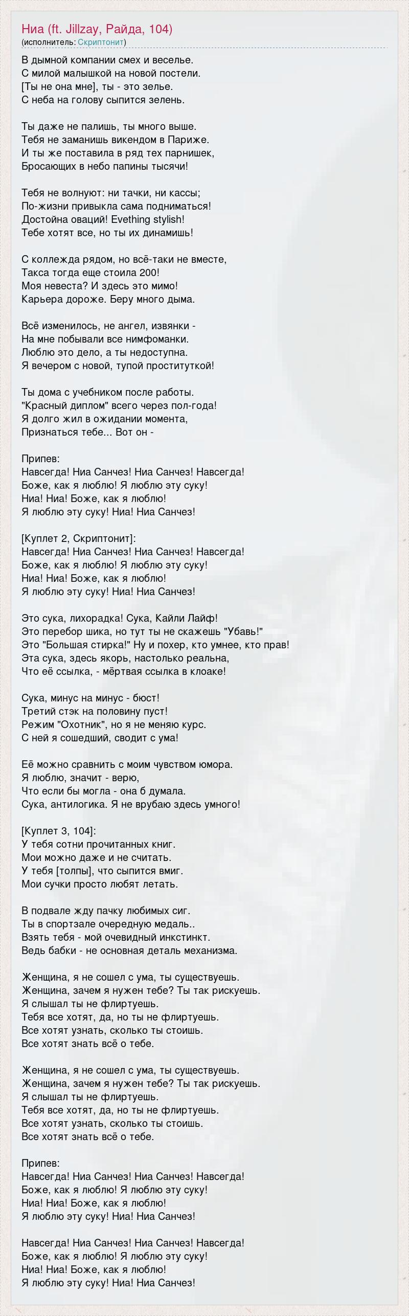 В дымной компании смех и веселье. С милой малышкой на новой постели. [Ты не она мне], ты - это зелье. С неба на голову сыпится зелень. Ты даже не палишь, ты много выше. Тебя не заманишь викендом в Париже. И ты же поставила в ряд тех парнишек, Бросающих в небо папины тысячи! Тебя не волнуют: ни тачки, ни кассы; По-жизни привыкла сама подниматься! Достойна оваций! Evething stylish! Тебе хотят все, но ты их динамишь! С коллежда рядом, но всё-таки не вместе, Такса тогда еще стоила 200! Моя невеста? И здесь это мимо! Карьера дороже. Беру много дыма. Всё изменилось, не ангел, извянки - На мне побывали все нимфоманки. Люблю это дело, а ты недоступна. Я вечером с новой, тупой проституткой! Ты дома с учебником после работы. "Красный диплом" всего через пол-года! Я долго жил в ожидании момента, Признаться тебе... Вот он - Припев: Навсегда! Ниа Санчез! Ниа Санчез! Навсегда! Боже, как я люблю! Я люблю эту суку! Ниа! Ниа! Боже, как я люблю! Я люблю эту суку! Ниа! Ниа Санчез! [Куплет 2, Скриптонит]: Навсегда! Ниа Санчез! Ниа Санчез! Навсегда! Боже, как я люблю! Я люблю эту суку! Ниа! Ниа! Боже, как я люблю! Я люблю эту суку! Ниа! Ниа Санчез! Это сука, лихорадка! Сука, Кайли Лайф! Это перебор шика, но тут ты не скажешь "Убавь!" Это "Большая стирка!" Ну и похер, кто умнее, кто прав! Эта сука, здесь якорь, настолько реальна, Что её ссылка, - мёртвая ссылка в клоаке! Сука, минус на минус - бюст! Третий стэк на половину пуст! Режим "Охотник", но я не меняю курс. С ней я сошедший, сводит с ума! Её можно сравнить с моим чувством юмора. Я люблю, значит - верю, Что если бы могла - она б думала. Сука, антилогика. Я не врубаю здесь умного! [Куплет 3, 104]: У тебя сотни прочитанных книг. Мои можно даже и не считать. У тебя [толпы], что сыпится вмиг. Мои сучки просто любят летать. В подвале жду пачку любимых сиг. Ты в спортзале очередную медаль.. Взять тебя - мой очевидный инкстинкт. Ведь бабки - не основная деталь механизма. Женщина, я не сошел с ума, ты существуешь. Женщина, зачем я нужен тебе? Ты так рискуешь. Я слышал ты не флиртуешь. Тебя все хотят, да, но ты не флиртуешь. Все хотят узнать, сколько ты стоишь. Все хотят знать всё о тебе. Женщина, я не сошел с ума, ты существуешь. Женщина, зачем я нужен тебе? Ты так рискуешь. Я слышал ты не флиртуешь. Тебя все хотят, да, но ты не флиртуешь. Все хотят узнать, сколько ты стоишь. Все хотят знать всё о тебе. Припев: Навсегда! Ниа Санчез! Ниа Санчез! Навсегда! Боже, как я люблю! Я люблю эту суку! Ниа! Ниа! Боже, как я люблю! Я люблю эту суку! Ниа! Ниа Санчез! Навсегда! Ниа Санчез! Ниа Санчез! Навсегда! Боже, как я люблю! Я люблю эту суку! Ниа! Ниа! Боже, как я люблю! Я люблю эту суку! Ниа! Ниа Санчез!