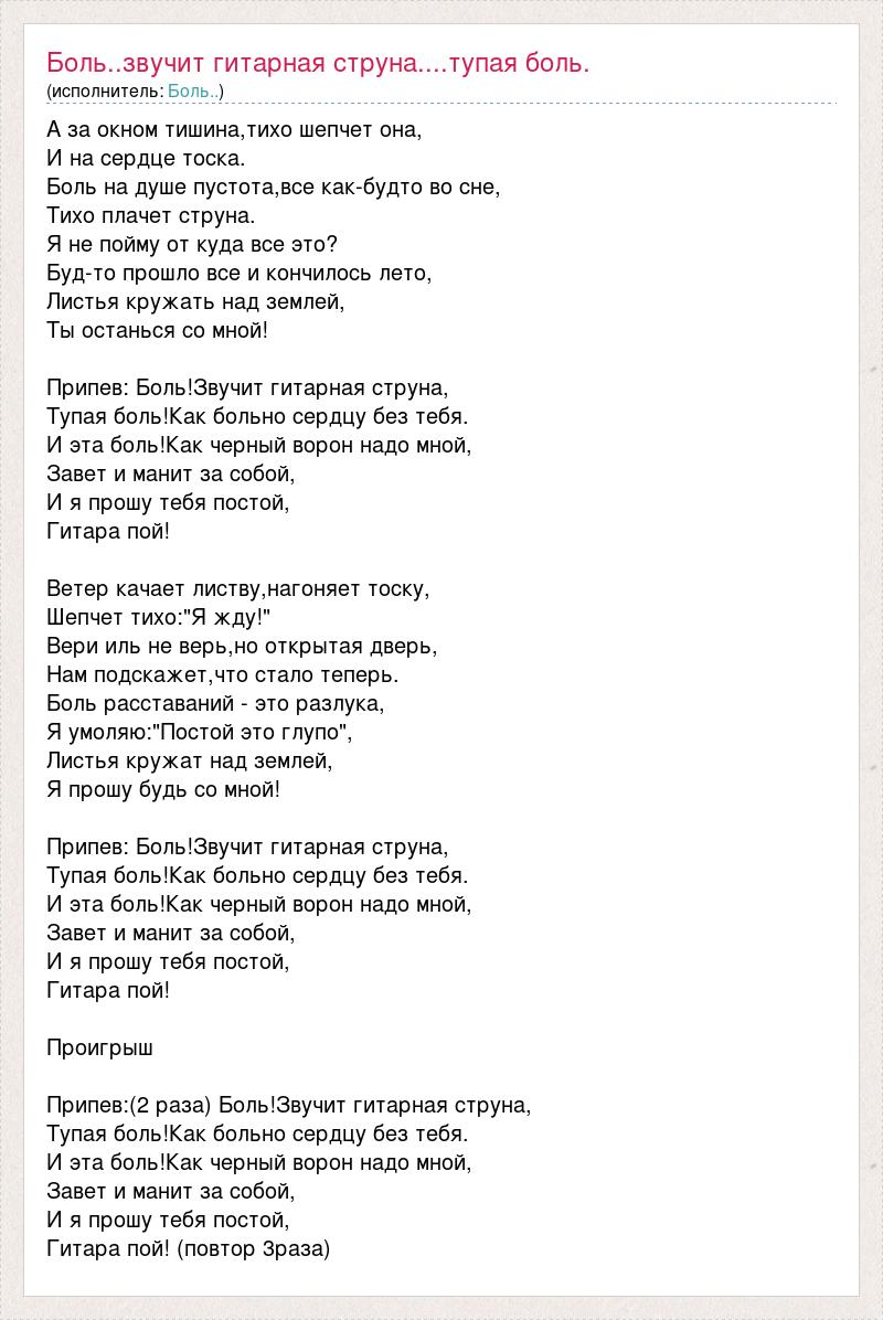 А за окном тишина,тихо шепчет она, И на сердце тоска. Боль на душе пустота,все как-будто во сне, Тихо плачет струна. Я не пойму от куда все это? Буд-то прошло все и кончилось лето, Листья кружать над землей, Ты останься со мной! Припев: Боль!Звучит гитарная струна, Тупая боль!Как больно сердцу без тебя. И эта боль!Как черный ворон надо мной, Завет и манит за собой, И я прошу тебя постой, Гитара пой! Ветер качает листву,нагоняет тоску, Шепчет тихо:"Я жду!" Вери иль не верь,но открытая дверь, Нам подскажет,что стало теперь. Боль расставаний - это разлука, Я умоляю:"Постой это глупо", Листья кружат над землей, Я прошу будь со мной! Припев: Боль!Звучит гитарная струна, Тупая боль!Как больно сердцу без тебя. И эта боль!Как черный ворон надо мной, Завет и манит за собой, И я прошу тебя постой, Гитара пой! Проигрыш Припев:(2 раза) Боль!Звучит гитарная струна, Тупая боль!Как больно сердцу без тебя. И эта боль!Как черный ворон надо мной, Завет и манит за собой, И я прошу тебя постой, Гитара пой! (повтор 3раза)