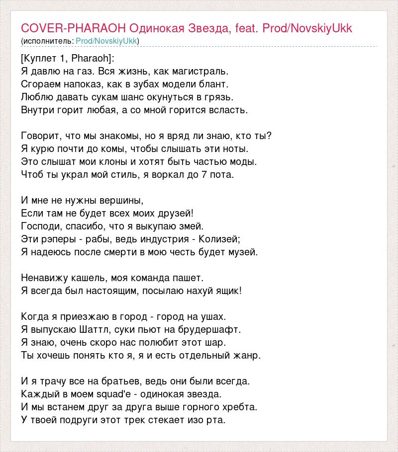 [Куплет 1, Pharaoh]: Я давлю на газ. Вся жизнь, как магистраль. Сгораем напоказ, как в зубах модели блант. Люблю давать сукам шанс окунуться в грязь. Внутри горит любая, а со мной горится всласть. Говорит, что мы знакомы, но я вряд ли знаю, кто ты? Я курю почти до комы, чтобы слышать эти ноты. Это слышат мои клоны и хотят быть частью моды. Чтоб ты украл мой стиль, я воркал до 7 пота. И мне не нужны вершины, Если там не будет всех моих друзей! Господи, спасибо, что я выкупаю змей. Эти рэперы - рабы, ведь индустрия - Колизей; Я надеюсь после смерти в мою честь будет музей. Ненавижу кашель, моя команда пашет. Я всегда был настоящим, посылаю нахуй ящик! Когда я приезжаю в город - город на ушах. Я выпускаю Шаттл, суки пьют на брудершафт. Я знаю, очень скоро нас полюбит этот шар. Ты хочешь понять кто я, я и есть отдельный жанр. И я трачу все на братьев, ведь они были всегда. Каждый в моем squad'е - одинокая звезда. И мы встанем друг за друга выше горного хребта. У твоей подруги этот трек стекает изо рта.