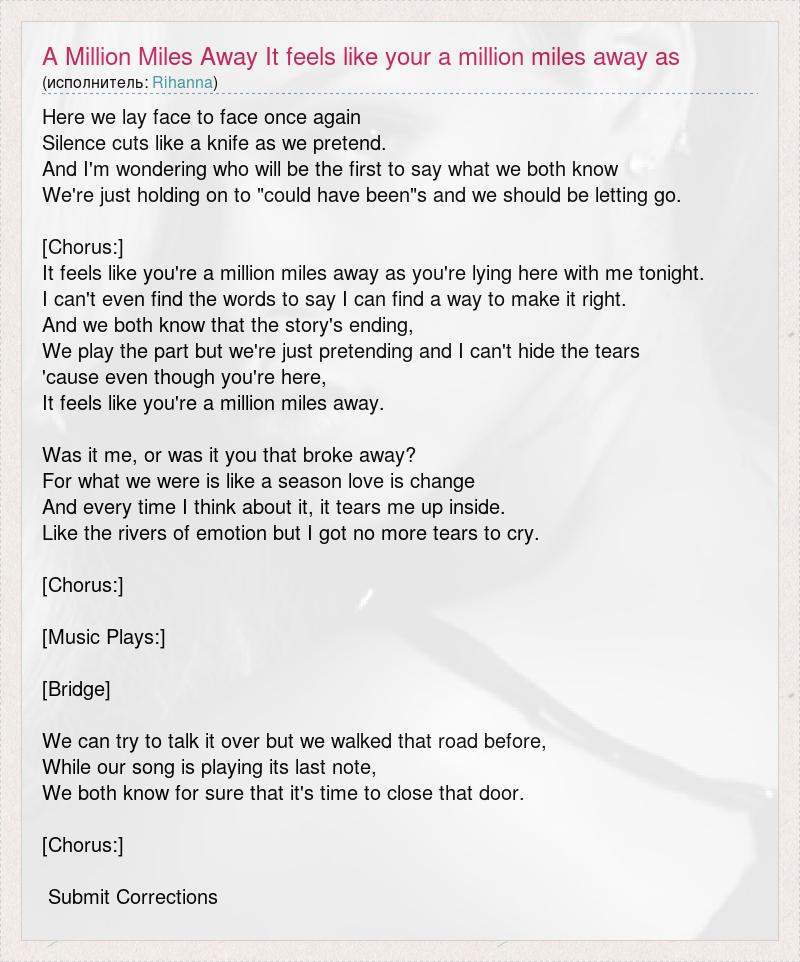 Here we lay face to face once again Silence cuts like a knife as we pretend. And I'm wondering who will be the first to say what we both know We're just holding on to "could have been"s and we should be letting go. [Chorus:] It feels like you're a million miles away as you're lying here with me tonight. I can't even find the words to say I can find a way to make it right. And we both know that the story's ending, We play the part but we're just pretending and I can't hide the tears 'cause even though you're here, It feels like you're a million miles away. Was it me, or was it you that broke away? For what we were is like a season love is change And every time I think about it, it tears me up inside. Like the rivers of emotion but I got no more tears to cry. [Chorus:] [Music Plays:] [Bridge] We can try to talk it over but we walked that road before, While our song is playing its last note, We both know for sure that it's time to close that door. [Chorus:] Submit Corrections