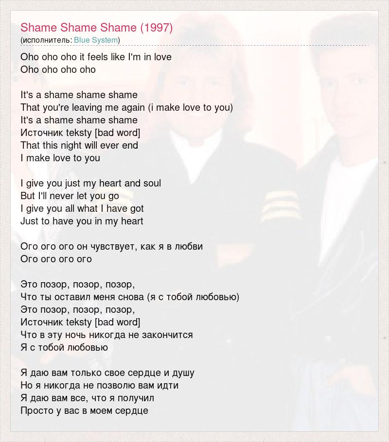 Oho oho oho it feels like I'm in love Oho oho oho oho It's a shame shame shame That you're leaving me again (i make love to you) It's a shame shame shame Источник teksty [bad word] That this night will ever end I make love to you I give you just my heart and soul But I'll never let you go I give you all what I have got Just to have you in my heart Ого ого ого он чувствует, как я в любви Ого ого ого ого Это позор, позор, позор, Что ты оставил меня снова (я с тобой любовью) Это позор, позор, позор, Источник teksty [bad word] Что в эту ночь никогда не закончится Я с тобой любовью Я даю вам только свое сердце и душу Но я никогда не позволю вам идти Я даю вам все, что я получил Просто у вас в моем сердце