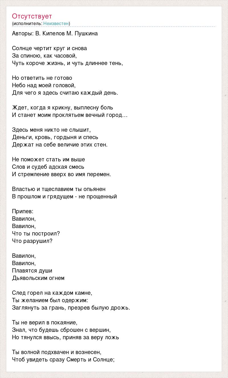Авторы: В. Кипелов М. Пушкина Солнце чертит круг и снова За спиною, как часовой, Чуть короче жизнь, и чуть длиннее тень, Но ответить не готово Небо над моей головой, Для чего я здесь считаю каждый день. Ждет, когда я крикну, выплесну боль И станет моим проклятьем вечный город… Здесь меня никто не слышит, Деньги, кровь, гордыня и спесь Держат на себе величие этих стен. Не поможет стать им выше Слов и судеб адская смесь И стремление вверх во имя перемен. Властью и тщеславием ты опьянен В прошлом и грядущем - не прощенный Припев: Вавилон, Вавилон, Что ты построил? Что разрушил? Вавилон, Вавилон, Плавятся души Дьявольским огнем След горел на каждом камне, Ты желанием был одержим: Заглянуть за грань, презрев былую дрожь. Ты не верил в покаяние, Знал, что будешь сброшен с вершин, Но тянулся ввысь, приняв за веру ложь Ты волной подхвачен и вознесен, Чтоб увидеть сразу Смерть и Солнце;