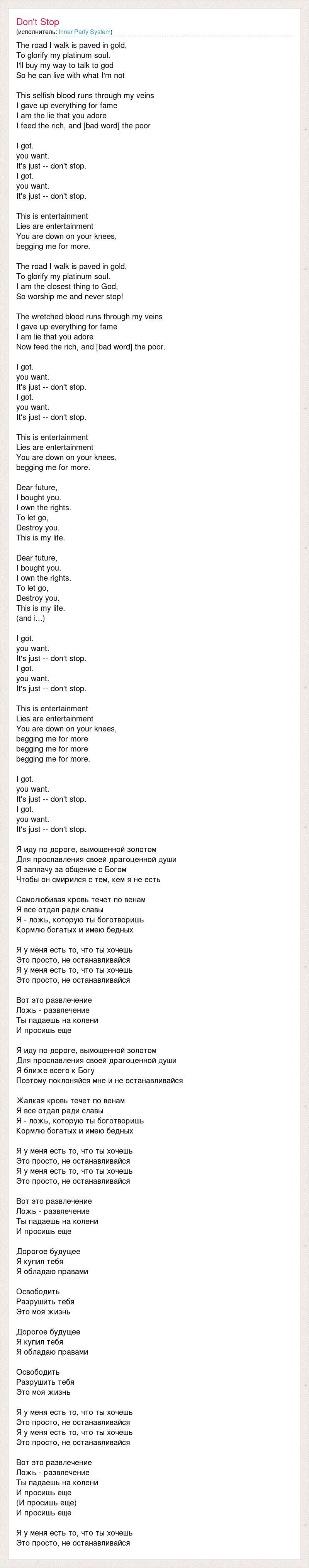 The road I walk is paved in gold, To glorify my platinum soul. I'll buy my way to talk to god So he can live with what I'm not This selfish blood runs through my veins I gave up everything for fame I am the lie that you adore I feed the rich, and [bad word] the poor I got. you want. It's just -- don't stop. I got. you want. It's just -- don't stop. This is entertainment Lies are entertainment You are down on your knees, begging me for more. The road I walk is paved in gold, To glorify my platinum soul. I am the closest thing to God, So worship me and never stop! The wretched blood runs through my veins I gave up everything for fame I am lie that you adore Now feed the rich, and [bad word] the poor. I got. you want. It's just -- don't stop. I got. you want. It's just -- don't stop. This is entertainment Lies are entertainment You are down on your knees, begging me for more. Dear future, I bought you. I own the rights. To let go, Destroy you. This is my life. Dear future, I bought you. I own the rights. To let go, Destroy you. This is my life. (and i...) I got. you want. It's just -- don't stop. I got. you want. It's just -- don't stop. This is entertainment Lies are entertainment You are down on your knees, begging me for more begging me for more begging me for more. I got. you want. It's just -- don't stop. I got. you want. It's just -- don't stop. Я иду по дороге, вымощенной золотом Для прославления своей драгоценной души Я заплачу за общение с Богом Чтобы он смирился с тем, кем я не есть Самолюбивая кровь течет по венам Я все отдал ради славы Я - ложь, которую ты боготворишь Кормлю богатых и имею бедных Я у меня есть то, что ты хочешь Это просто, не останавливайся Я у меня есть то, что ты хочешь Это просто, не останавливайся Вот это развлечение Ложь - развлечение Ты падаешь на колени И просишь еще Я иду по дороге, вымощенной золотом Для прославления своей драгоценной души Я ближе всего к Богу Поэтому поклоняйся мне и не останавливайся Жалкая кровь течет по венам Я все отдал ради славы Я - ложь, которую ты боготворишь Кормлю богатых и имею бедных Я у меня есть то, что ты хочешь Это просто, не останавливайся Я у меня есть то, что ты хочешь Это просто, не останавливайся Вот это развлечение Ложь - развлечение Ты падаешь на колени И просишь еще Дорогое будущее Я купил тебя Я обладаю правами Освободить Разрушить тебя Это моя жизнь Дорогое будущее Я купил тебя Я обладаю правами Освободить Разрушить тебя Это моя жизнь Я у меня есть то, что ты хочешь Это просто, не останавливайся Я у меня есть то, что ты хочешь Это просто, не останавливайся Вот это развлечение Ложь - развлечение Ты падаешь на колени И просишь еще (И просишь еще) И просишь еще Я у меня есть то, что ты хочешь Это просто, не останавливайся