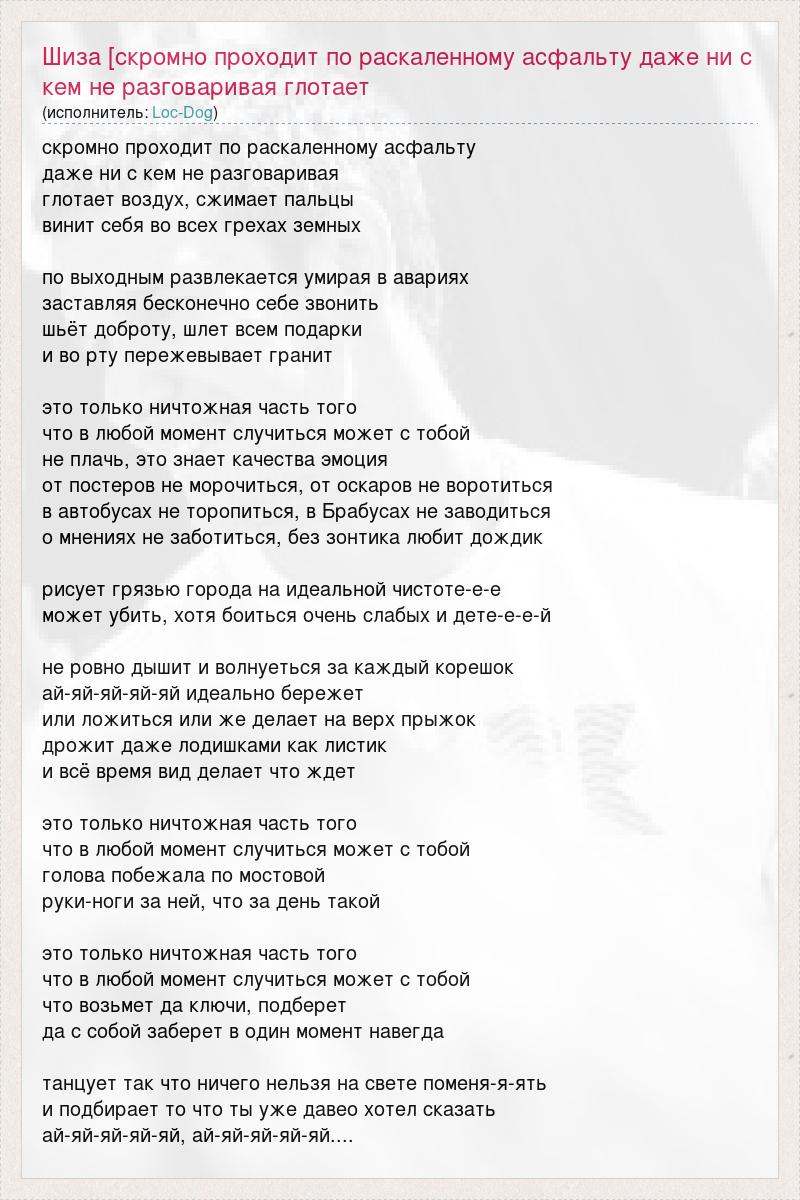 скромно проходит по раскаленному асфальту даже ни с кем не разговаривая глотает воздух, сжимает пальцы винит себя во всех грехах земных по выходным развлекается умирая в авариях заставляя бесконечно себе звонить шьёт доброту, шлет всем подарки и во рту пережевывает гранит это только ничтожная часть того что в любой момент случиться может с тобой не плачь, это знает качества эмоция от постеров не морочиться, от оскаров не воротиться в автобусах не торопиться, в Брабусах не заводиться о мнениях не заботиться, без зонтика любит дождик рисует грязью города на идеальной чистоте-е-е может убить, хотя боиться очень слабых и дете-е-е-й не ровно дышит и волнуеться за каждый корешок ай-яй-яй-яй-яй идеально бережет или ложиться или же делает на верх прыжок дрожит даже лодишками как листик и всё время вид делает что ждет это только ничтожная часть того что в любой момент случиться может с тобой голова побежала по мостовой руки-ноги за ней, что за день такой это только ничтожная часть того что в любой момент случиться может с тобой что возьмет да ключи, подберет да с собой заберет в один момент навегда танцует так что ничего нельзя на свете поменя-я-ять и подбирает то что ты уже давео хотел сказать ай-яй-яй-яй-яй, ай-яй-яй-яй-яй....