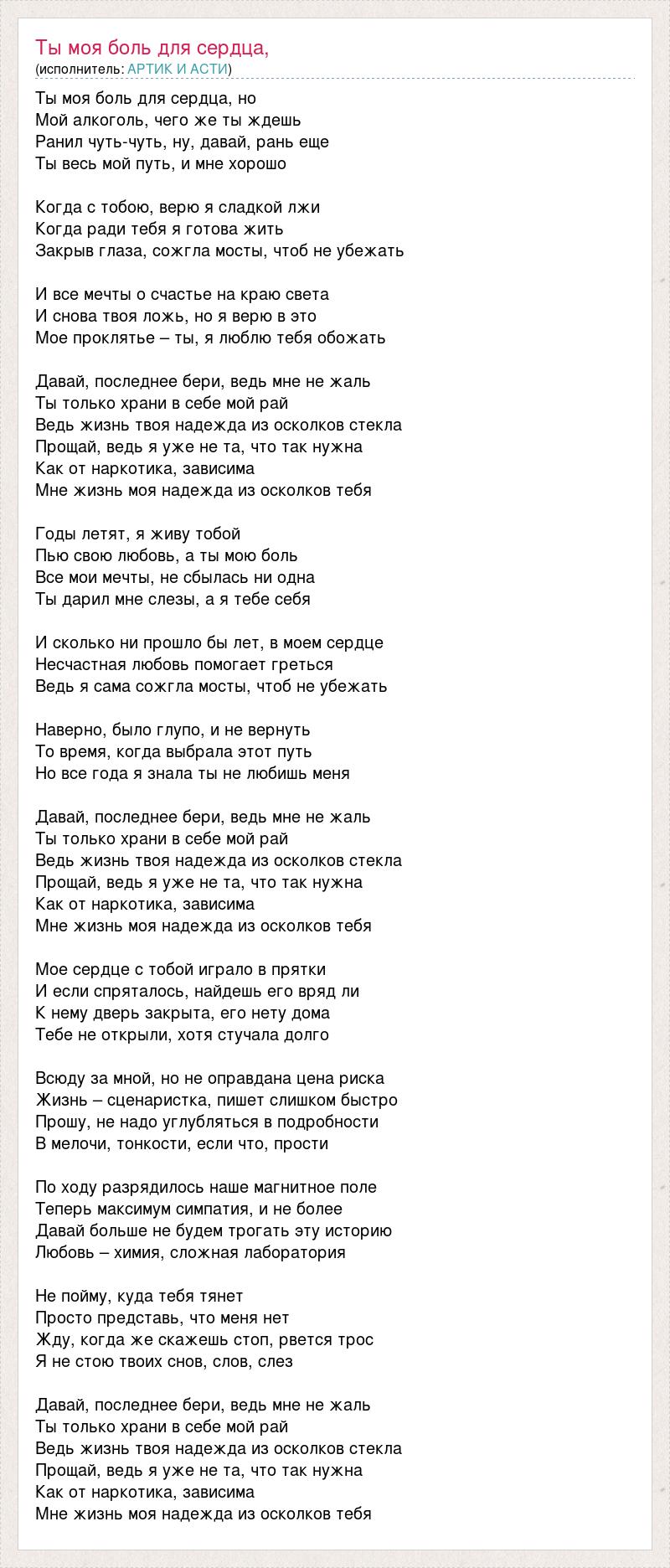 Ты моя боль для сердца, но Мой алкоголь, чего же ты ждешь Ранил чуть-чуть, ну, давай, рань еще Ты весь мой путь, и мне хорошо Когда с тобою, верю я сладкой лжи Когда ради тебя я готова жить Закрыв глаза, сожгла мосты, чтоб не убежать И все мечты о счастье на краю света И снова твоя ложь, но я верю в это Мое проклятье – ты, я люблю тебя обожать Давай, последнее бери, ведь мне не жаль Ты только храни в себе мой рай Ведь жизнь твоя надежда из осколков стекла Прощай, ведь я уже не та, что так нужна Как от наркотика, зависима Мне жизнь моя надежда из осколков тебя Годы летят, я живу тобой Пью свою любовь, а ты мою боль Все мои мечты, не сбылась ни одна Ты дарил мне слезы, а я тебе себя И сколько ни прошло бы лет, в моем сердце Несчастная любовь помогает греться Ведь я сама сожгла мосты, чтоб не убежать Наверно, было глупо, и не вернуть То время, когда выбрала этот путь Но все года я знала ты не любишь меня Давай, последнее бери, ведь мне не жаль Ты только храни в себе мой рай Ведь жизнь твоя надежда из осколков стекла Прощай, ведь я уже не та, что так нужна Как от наркотика, зависима Мне жизнь моя надежда из осколков тебя Мое сердце с тобой играло в прятки И если спряталось, найдешь его вряд ли К нему дверь закрыта, его нету дома Тебе не открыли, хотя стучала долго Всюду за мной, но не оправдана цена риска Жизнь – сценаристка, пишет слишком быстро Прошу, не надо углубляться в подробности В мелочи, тонкости, если что, прости По ходу разрядилось наше магнитное поле Теперь максимум симпатия, и не более Давай больше не будем трогать эту историю Любовь – химия, сложная лаборатория Не пойму, куда тебя тянет Просто представь, что меня нет Жду, когда же скажешь стоп, рвется трос Я не стою твоих снов, слов, слез Давай, последнее бери, ведь мне не жаль Ты только храни в себе мой рай Ведь жизнь твоя надежда из осколков стекла Прощай, ведь я уже не та, что так нужна Как от наркотика, зависима Мне жизнь моя надежда из осколков тебя