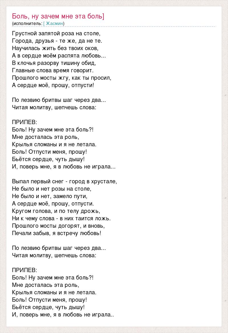 Грустной запятой роза на столе, Города, друзья - те же, да не те. Научилась жить без твоих оков, А в сердце моём распята любовь... В клочья разорву тишину обид, Главные слова время говорит. Прошлого мосты жгу, как ты просил, А сердце моё, прошу, отпусти! По лезвию бритвы шаг через два... Читая молитву, шепчешь слова: ПРИПЕВ: Боль! Ну зачем мне эта боль?! Мне досталась эта роль, Крылья сломаны и я не летала. Боль! Отпусти меня, прошу! Бьётся сердце, чуть дышу! И, поверь мне, я в любовь не играла... Выпал первый снег - город в хрустале, Не было и нет розы на столе, Не было и нет, замело пути, А сердце моё, прошу, отпусти. Кругом голова, и по телу дрожь, Ни к чему слова - в них таится ложь. Прошлого мосты догорят, и вновь, Печали забыв, я встречу любовь! По лезвию бритвы шаг через два... Читая молитву, шепчешь слова: ПРИПЕВ: Боль! Ну зачем мне эта боль?! Мне досталась эта роль, Крылья сломаны и я не летала. Боль! Отпусти меня, прошу! Бьётся сердце, чуть дышу! И, поверь мне, я в любовь не играла..