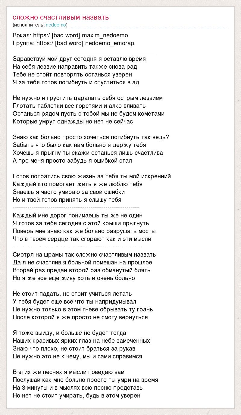 Вокал: https:/ [bad word] maxim_nedoemo Группа: https:/ [bad word] nedoemo_emorap ___________________________________________ Здравствуй мой друг сегодня я оставлю время На себя лезвие направить также снова рад Тебе не стойт повторять останься уверен Я за тебя готов погибнуть и спуститься в ад Не нужно и грустить царапать себя острым лезвием Глотать таблетки все горстями и алко вливать Останься рядом пусть с тобой мы не будем кометами Которые умрут однажды но нет не сейчас Знаю как больно просто хочеться погибнуть так ведь? Забыть что было как нам больно я держу тебя Хочешь я прыгну ты скажи останься лишь счастлива А про меня просто забудь я ошибкой стал Готов потратись свою жизнь за тебя ты мой искренний Каждый кто помогает жить я же люблю тебя Знаешь я часто умираю за свой ошибки Но и твой готов принять я слышу тебя ------------------------------------------------------------ Каждый мне дорог понимаешь ты же не один Я готов за тебя сегодня с этой крыши прыгнуть Поверь мне знаю как же больно разрушать мосты Что в твоем сердце так сгорают как и эти мысли ------------------------------------------------------------- Смотря на шрамы так сложно счастливым назвать Да я не счастлив я больной помешан на прошлое Вторай раз предан второй раз обманутый блять Но я же все еще живу хоть и очень больно Не стоит падать, не стоит учиться летать У тебя будет еще все что ты напридумывал Не нужно только в этом гневе обрывать ту грань После которой я же просто не смогу вернуться Я тоже выйду, и больше не будет тогда Наших красивых ярких глаз на небе замеченных Знаю что плохо, не стоит браться за рукав Не нужно это не к чему, мы и сами справимся В этих же песнях я мысли поведаю вам Послушай как мне больно просто ты умри на время На 3 минуты и в мыслях всю песню представь Но нет не стоит умирать, будь в этом уверен