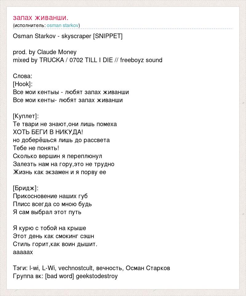 Osman Starkov - skyscraper [SNIPPET] prod. by Claude Money mixed by TRUCKA / 0702 TILL I DIE // freeboyz sound Слова: [Hook]: Все мои кентыы - любят запах живанши Все мои кенты- любят запах живанши [Куплет]: Те твари не знают,они лишь помеха ХОТЬ БЕГИ В НИКУДА! но доберёшься лишь до рассвета Тебе не понять! Сколько вершин я переплюнул Залезть нам на гору,это не трудно Жизнь как экзамен и я порву ее [Бридж]: Прикосновение наших губ Плисс всегда со мною будь Я сам выбрал этот путь Я курю с тобой на крыше Этот день как смокинг сэшн Стиль горит,как воин дышит. ааааах Тэги: l-wi, L-Wi, vechnostcult, вечность, Осман Старков Группа вк: [bad word] geekstodestroy