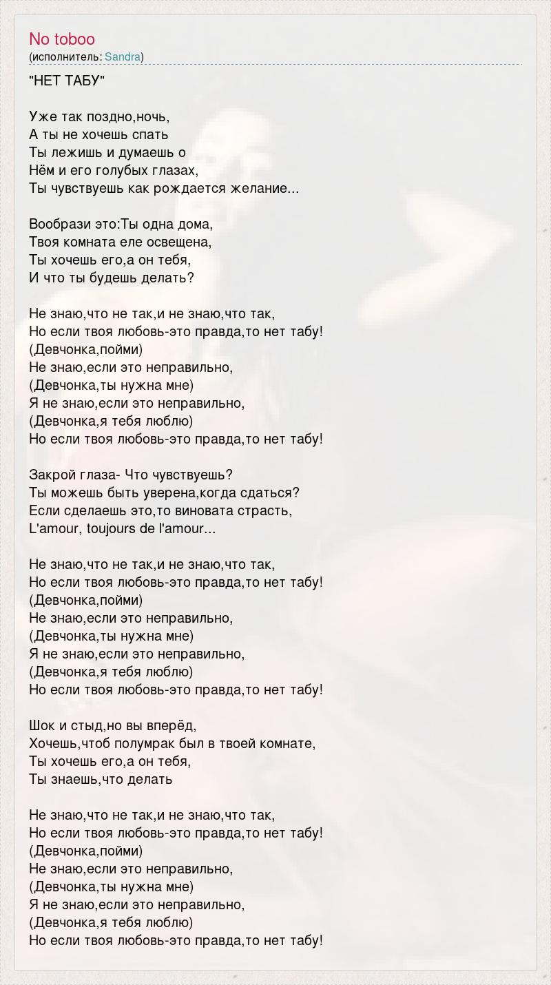 "НЕТ ТАБУ" Уже так поздно,ночь, А ты не хочешь спать Ты лежишь и думаешь о Нём и его голубых глазах, Ты чувствуешь как рождается желание... Вообрази это:Ты одна дома, Твоя комната еле освещена, Ты хочешь его,а он тебя, И что ты будешь делать? Не знаю,что не так,и не знаю,что так, Но если твоя любовь-это правда,то нет табу! (Девчонка,пойми) Не знаю,если это неправильно, (Девчонка,ты нужна мне) Я не знаю,если это неправильно, (Девчонка,я тебя люблю) Но если твоя любовь-это правда,то нет табу! Закрой глаза- Что чувствуешь? Ты можешь быть уверена,когда сдаться? Если сделаешь это,то виновата страсть, L'amour, toujours de l'amour... Не знаю,что не так,и не знаю,что так, Но если твоя любовь-это правда,то нет табу! (Девчонка,пойми) Не знаю,если это неправильно, (Девчонка,ты нужна мне) Я не знаю,если это неправильно, (Девчонка,я тебя люблю) Но если твоя любовь-это правда,то нет табу! Шок и стыд,но вы вперёд, Хочешь,чтоб полумрак был в твоей комнате, Ты хочешь его,а он тебя, Ты знаешь,что делать Не знаю,что не так,и не знаю,что так, Но если твоя любовь-это правда,то нет табу! (Девчонка,пойми) Не знаю,если это неправильно, (Девчонка,ты нужна мне) Я не знаю,если это неправильно, (Девчонка,я тебя люблю) Но если твоя любовь-это правда,то нет табу!