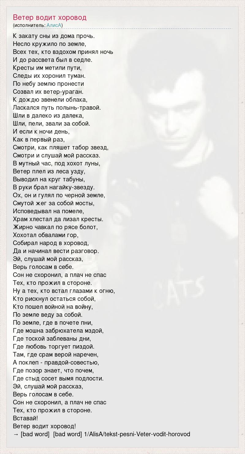 К закату сны из дома прочь. Несло кружило по земле, Всех тех, кто вздохом принял ночь И до рассвета был в седле. Кресты им метили пути, Следы их хоронил туман. По небу землю пронести Созвал их ветер-ураган. К дождю звенели облака, Ласкался путь полынь-травой. Шли в далеко из далека, Шли, пели, звали за собой. И если к ночи день, Как в первый раз, Смотри, как пляшет табор звезд, Смотри и слушай мой рассказ. В мутный час, под хохот луны, Ветер плел из леса узду, Выводил на круг табуны, В руки брал нагайку-звезду. Ох, он и гулял по черной земле, Смутой жег за собой мосты, Исповедывал на помеле, Храм хлестал да лизал кресты. Жирно чавкал по рясе болот, Хохотал обвалами гор, Собирал народ в хоровод, Да и начинал вести разговор. Эй, слушай мой рассказ, Верь голосам в себе. Сон не схоронил, а плач не спас Тех, кто прожил в стороне. Ну а тех, кто встал глазами к огню, Кто рискнул остаться собой, Кто пошел войной на войну, По земле веду за собой. По земле, где в почете пни, Где мошна забрюхатела мздой, Где тоской заблеваны дни, Где любовь торгует пиздой. Там, где срам верой наречен, А поклеп - правдой-совестью, Где позор знает, что почем, Где стыд сосет вымя подлости. Эй, слушай мой рассказ, Верь голосам в себе. Сон не схоронил, а плач не спас Тех, кто прожил в стороне. Вставай! Ветер водит хоровод! → [bad word] [bad word] 1/AlisA/tekst-pesni-Veter-vodit-horovod