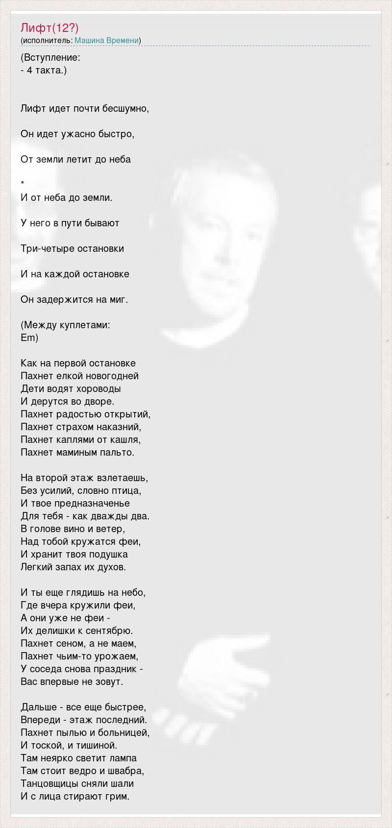 (Вступление: - 4 такта.) Лифт идет почти бесшумно, Он идет ужасно быстро, От земли летит до неба * И от неба до земли. У него в пути бывают Три-четыре остановки И на каждой остановке Он задержится на миг. (Между куплетами: Em) Как на первой остановке Пахнет елкой новогодней Дети водят хороводы И дерутся во дворе. Пахнет радостью открытий, Пахнет страхом наказний, Пахнет каплями от кашля, Пахнет маминым пальто. На второй этаж взлетаешь, Без усилий, словно птица, И твое предназначенье Для тебя - как дважды два. В голове вино и ветер, Над тобой кружатся феи, И хранит твоя подушка Легкий запах их духов. И ты еще глядишь на небо, Где вчера кружили феи, А они уже не феи - Их делишки к сентябрю. Пахнет сеном, а не маем, Пахнет чьим-то урожаем, У соседа снова праздник - Вас впервые не зовут. Дальше - все еще быстрее, Впереди - этаж последний. Пахнет пылью и больницей, И тоской, и тишиной. Там неярко светит лампа Там стоит ведро и швабра, Танцовщицы сняли шали И с лица стирают грим.