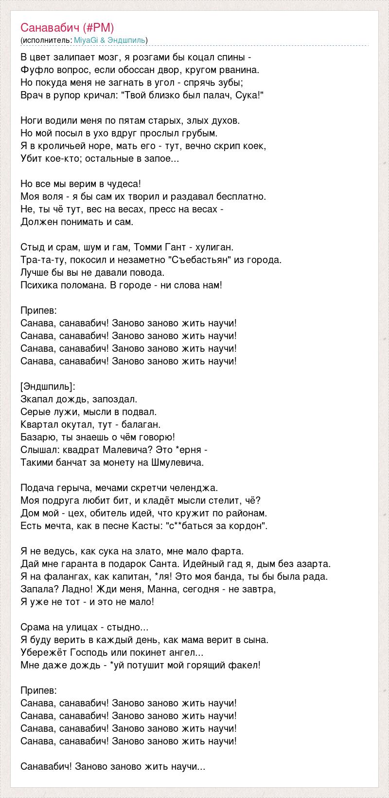В цвет залипает мозг, я розгами бы коцал спины - Фуфло вопрос, если обоссан двор, кругом рванина. Но покуда меня не загнать в угол - спрячь зубы; Врач в рупор кричал: "Твой близко был палач, Сука!" Ноги водили меня по пятам старых, злых духов. Но мой посыл в ухо вдруг прослыл грубым. Я в кроличьей норе, мать его - тут, вечно скрип коек, Убит кое-кто; остальные в запое... Но все мы верим в чудеса! Моя воля - я бы сам их творил и раздавал бесплатно. Не, ты чё тут, вес на весах, пресс на весах - Должен понимать и сам. Стыд и срам, шум и гам, Томми Гант - хулиган. Тра-та-ту, покосил и незаметно "Съебастьян" из города. Лучше бы вы не давали повода. Психика поломана. В городе - ни слова нам! Припев: Санава, санавабич! Заново заново жить научи! Санава, санавабич! Заново заново жить научи! Санава, санавабич! Заново заново жить научи! Санава, санавабич! Заново заново жить научи! [Эндшпиль]: Зкапал дождь, запоздал. Серые лужи, мысли в подвал. Квартал окутал, тут - балаган. Базарю, ты знаешь о чём говорю! Слышал: квадрат Малевича? Это *ерня - Такими банчат за монету на Шмулевича. Подача герыча, мечами скретчи челенджа. Моя подруга любит бит, и кладёт мысли стелит, чё? Дом мой - цех, обитель идей, что кружит по районам. Есть мечта, как в песне Касты: "с**баться за кордон". Я не ведусь, как сука на злато, мне мало фарта. Дай мне гаранта в подарок Санта. Идейный гад я, дым без азарта. Я на фалангах, как капитан, *ля! Это моя банда, ты бы была рада. Запала? Ладно! Жди меня, Манна, сегодня - не завтра, Я уже не тот - и это не мало! Срама на улицах - стыдно... Я буду верить в каждый день, как мама верит в сына. Убережёт Господь или покинет ангел... Мне даже дождь - *уй потушит мой горящий факел! Припев: Санава, санавабич! Заново заново жить научи! Санава, санавабич! Заново заново жить научи! Санава, санавабич! Заново заново жить научи! Санава, санавабич! Заново заново жить научи! Санавабич! Заново заново жить научи...