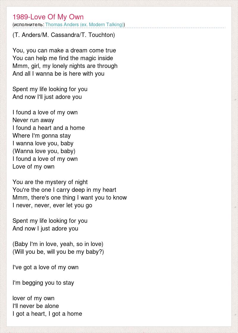 (T. Anders/M. Cassandra/T. Touchton) You, you can make a dream come true You can help me find the magic inside Mmm, girl, my lonely nights are through And all I wanna be is here with you Spent my life looking for you And now I'll just adore you I found a love of my own Never run away I found a heart and a home Where I'm gonna stay I wanna love you, baby (Wanna love you, baby) I found a love of my own Love of my own You are the mystery of night You're the one I carry deep in my heart Mmm, there's one thing I want you to know I never, never, ever let you go Spent my life looking for you And now I just adore you (Baby I'm in love, yeah, so in love) (Will you be, will you be my baby?) I've got a love of my own I'm begging you to stay lover of my own I'll never be alone I got a heart, I got a home