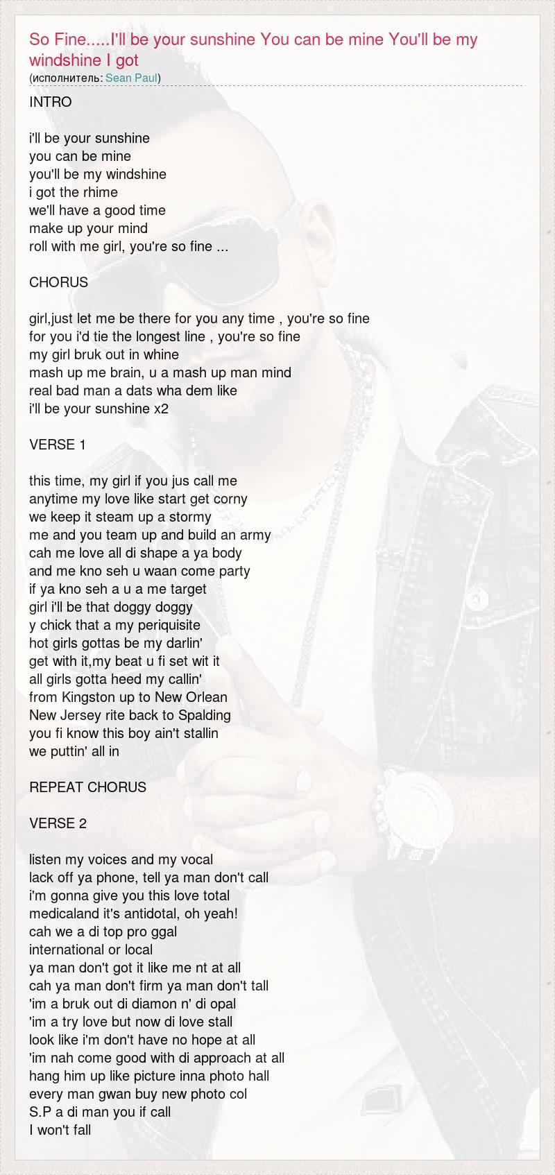 INTRO i'll be your sunshine you can be mine you'll be my windshine i got the rhime we'll have a good time make up your mind roll with me girl, you're so fine ... CHORUS girl,just let me be there for you any time , you're so fine for you i'd tie the longest line , you're so fine my girl bruk out in whine mash up me brain, u a mash up man mind real bad man a dats wha dem like i'll be your sunshine x2 VERSE 1 this time, my girl if you jus call me anytime my love like start get corny we keep it steam up a stormy me and you team up and build an army cah me love all di shape a ya body and me kno seh u waan come party if ya kno seh a u a me target girl i'll be that doggy doggy y chick that a my periquisite hot girls gottas be my darlin' get with it,my beat u fi set wit it all girls gotta heed my callin' from Kingston up to New Orlean New Jersey rite back to Spalding you fi know this boy ain't stallin we puttin' all in REPEAT CHORUS VERSE 2 listen my voices and my vocal lack off ya phone, tell ya man don't call i'm gonna give you this love total medicaland it's antidotal, oh yeah! cah we a di top pro ggal international or local ya man don't got it like me nt at all cah ya man don't firm ya man don't tall 'im a bruk out di diamon n' di opal 'im a try love but now di love stall look like i'm don't have no hope at all 'im nah come good with di approach at all hang him up like picture inna photo hall every man gwan buy new photo col S.P a di man you if call I won't fall