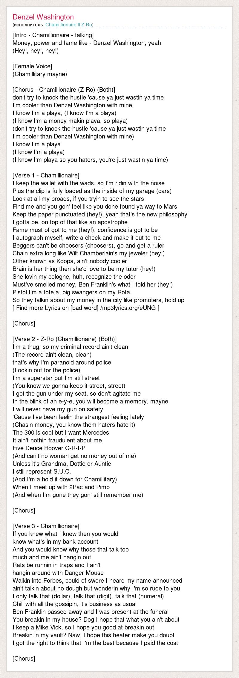 [Intro - Chamillionaire - talking] Money, power and fame like - Denzel Washington, yeah (Hey!, hey!, hey!) [Female Voice] (Chamillitary mayne) [Chorus - Chamillionaire (Z-Ro) (Both)] don't try to knock the hustle 'cause ya just wastin ya time I'm cooler than Denzel Washington with mine I know I'm a playa, (I know I'm a playa) (I know I'm a money makin playa, so playa) (don't try to knock the hustle 'cause ya just wastin ya time I'm cooler than Denzel Washington with mine) I know I'm a playa (I know I'm a playa) (I know I'm playa so you haters, you're just wastin ya time) [Verse 1 - Chamillionaire] I keep the wallet with the wads, so I'm ridin with the noise Plus the clip is fully loaded as the inside of my garage (cars) Look at all my broads, if you tryin to see the stars Find me and you gon' feel like you done found ya way to Mars Keep the paper punctuated (hey!), yeah that's the new philosophy I gotta be, on top of that like an apostrophe Fame must of got to me (hey!), confidence is got to be I autograph myself, write a check and make it out to me Beggers can't be choosers (choosers), go and get a ruler Chain extra long like Wilt Chamberlain's my jeweler (hey!) Other known as Koopa, ain't nobody cooler Brain is her thing then she'd love to be my tutor (hey!) She lovin my cologne, huh, recognize the odor Must've smelled money, Ben Franklin's what I told her (hey!) Pistol I'm a tote a, big swangers on my Rota So they talkin about my money in the city like promoters, hold up [ Find more Lyrics on [bad word] /mp3lyrics.org/eUNG ] [Chorus] [Verse 2 - Z-Ro (Chamillionaire) (Both)] I'm a thug, so my criminal record ain't clean (The record ain't clean, clean) that's why I'm paranoid around police (Lookin out for the police) I'm a superstar but I'm still street (You know we gonna keep it street, street) I got the gun under my seat, so don't agitate me In the blink of an e-y-e, you will become a memory, mayne I will never have my gun on safety 'Cause I've been feelin the strangest feeling lately (Chasin money, you know them haters hate it) The 300 is cool but I want Mercedes It ain't nothin fraudulent about me Five Deuce Hoover C-R-I-P (And can't no woman get no money out of me) Unless it's Grandma, Dottie or Auntie I still represent S.U.C. (And I'm a hold it down for Chamillitary) When I meet up with 2Pac and Pimp (And when I'm gone they gon' still remember me) [Chorus] [Verse 3 - Chamillionaire] If you knew what I knew then you would know what's in my bank account And you would know why those that talk too much and me ain't hangin out Rats be runnin in traps and I ain't hangin around with Danger Mouse Walkin into Forbes, could of swore I heard my name announced ain't talkin about no dough but wonderin why I'm so rude to you I only talk that (dollar), talk that (digit), talk that (numeral) Chill with all the gossipin, it's business as usual Ben Franklin passed away and I was present at the funeral You breakin in my house? Dog I hope that what you ain't about I keep a Mike Vick, so I hope you good at breakin out Breakin in my vault? Naw, I hope this heater make you doubt I got the right to think that I'm the best because I paid the cost [Chorus]