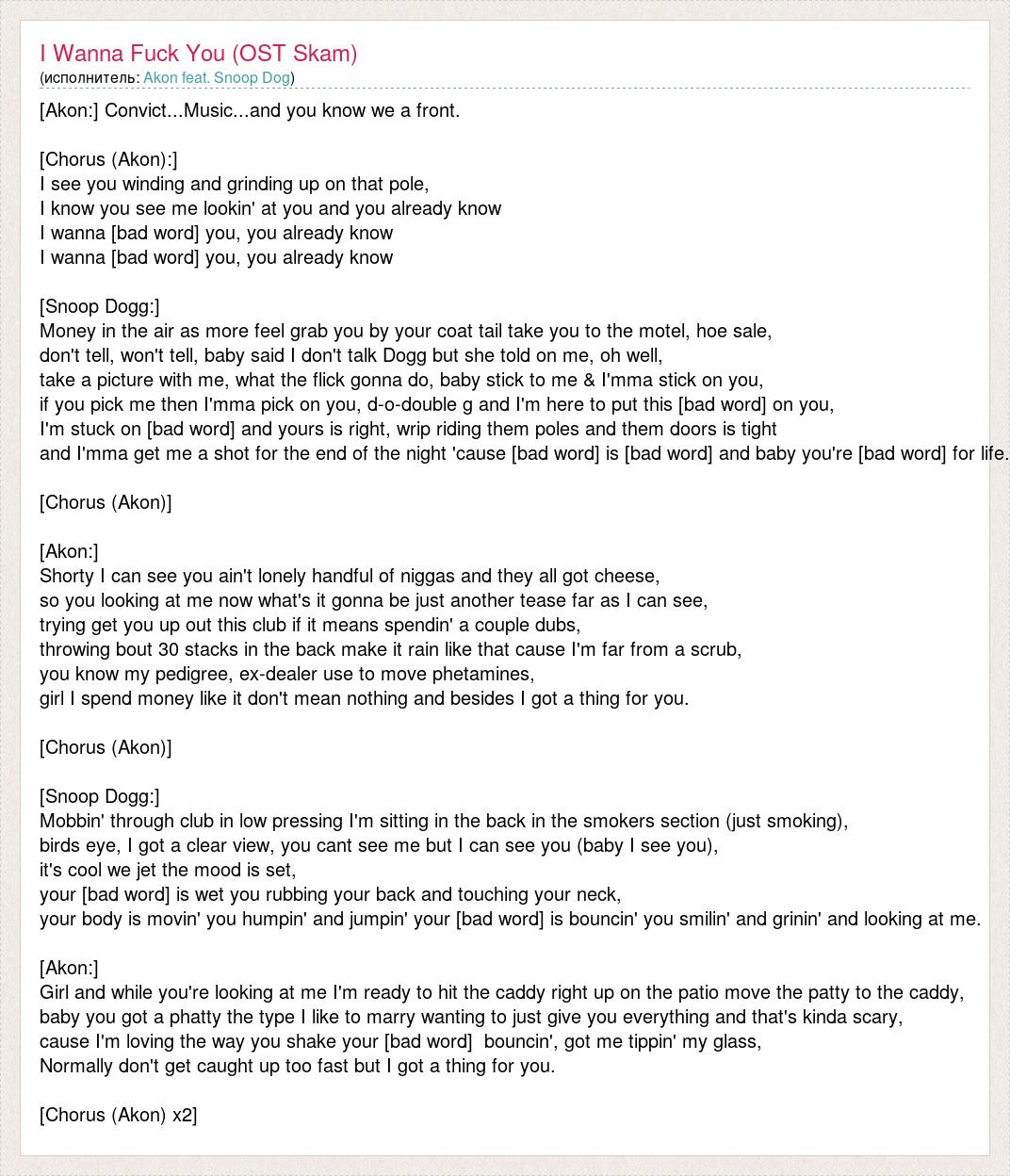 [Akon:] Convict...Music...and you know we a front. [Chorus (Akon):] I see you winding and grinding up on that pole, I know you see me lookin' at you and you already know I wanna [bad word] you, you already know I wanna [bad word] you, you already know [Snoop Dogg:] Money in the air as more feel grab you by your coat tail take you to the motel, hoe sale, don't tell, won't tell, baby said I don't talk Dogg but she told on me, oh well, take a picture with me, what the flick gonna do, baby stick to me & I'mma stick on you, if you pick me then I'mma pick on you, d-o-double g and I'm here to put this [bad word] on you, I'm stuck on [bad word] and yours is right, wrip riding them poles and them doors is tight and I'mma get me a shot for the end of the night 'cause [bad word] is [bad word] and baby you're [bad word] for life. [Chorus (Akon)] [Akon:] Shorty I can see you ain't lonely handful of niggas and they all got cheese, so you looking at me now what's it gonna be just another tease far as I can see, trying get you up out this club if it means spendin' a couple dubs, throwing bout 30 stacks in the back make it rain like that cause I'm far from a scrub, you know my pedigree, ex-dealer use to move phetamines, girl I spend money like it don't mean nothing and besides I got a thing for you. [Chorus (Akon)] [Snoop Dogg:] Mobbin' through club in low pressing I'm sitting in the back in the smokers section (just smoking), birds eye, I got a clear view, you cant see me but I can see you (baby I see you), it's cool we jet the mood is set, your [bad word] is wet you rubbing your back and touching your neck, your body is movin' you humpin' and jumpin' your [bad word] is bouncin' you smilin' and grinin' and looking at me. [Akon:] Girl and while you're looking at me I'm ready to hit the caddy right up on the patio move the patty to the caddy, baby you got a phatty the type I like to marry wanting to just give you everything and that's kinda scary, cause I'm loving the way you shake your [bad word] bouncin', got me tippin' my glass, Normally don't get caught up too fast but I got a thing for you. [Chorus (Akon) x2]