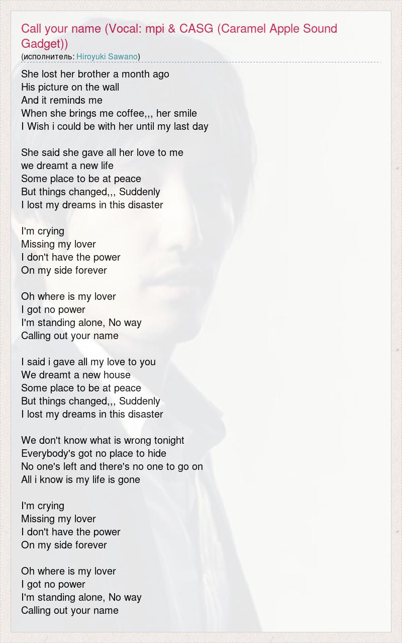 She lost her brother a month ago His picture on the wall And it reminds me When she brings me coffee,,, her smile I Wish i could be with her until my last day She said she gave all her love to me we dreamt a new life Some place to be at peace But things changed,,, Suddenly I lost my dreams in this disaster I'm crying Missing my lover I don't have the power On my side forever Oh where is my lover I got no power I'm standing alone, No way Calling out your name I said i gave all my love to you We dreamt a new house Some place to be at peace But things changed,,, Suddenly I lost my dreams in this disaster We don't know what is wrong tonight Everybody's got no place to hide No one's left and there's no one to go on All i know is my life is gone I'm crying Missing my lover I don't have the power On my side forever Oh where is my lover I got no power I'm standing alone, No way Calling out your name