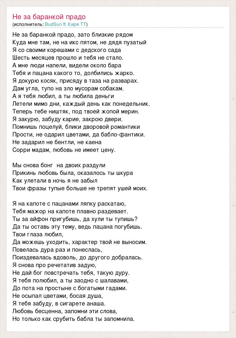 Не за баранкой прадо, зато близкие рядом Куда мне там, не на икс пятом, не дядя пузатый Я со своими корешами с дедского сада Шесть месяцев прошло и тебя не стало. А мне люди напели, видели около бара Тебя и пацана какого то, долбились жарко. Я докурю косяк, присяду в таза на разварах. Дам угла, тупо на зло мусорам собакам. А я тебя любил, а ты любила деньги Летели мимо дни, каждый день как понедельник. Теперь тебе ништяк, под твоей жопой мерин. Я закурю, забуду карие, закрою двери. Помнишь поцелуй, блики дворовой романтики Прости, не одарил цветами, да бабло-фантики. Не задарил не бентли, не каена Сорри мадам, любовь не имеет цену. Мы снова бонг на двоих раздули Прикинь любовь была, оказалось ты шкура Как улетали в ночь я не забыл Твои фразы тупые больше не трепят ушей моих. Я на капоте с пацанами ляпку раскатаю, Тебя мажор на капоте плавно раздевает. Ты за айфон пригубишь, да хули ты тупишь? Да ты оставь эту тему, ведь пацана погубишь. Твои глаза любил, Да можешь уходить, характер твой не выносим. Повелась дура раз и понеслась, Поиздевалась вдоволь, до другого добралась. Я снова про речетатив задую, Не дай бог повстречать тебя, такую дуру. Я тебя полюбил, а ты заодно с шалавами, До пота на простыне с богатыми гадами. Не осыпал цветами, босая душа, Я тебя забуду, в сигарете анаша. Любовь бесценна, запомни эти слова, Но только как срубить бабла ты запомнила.