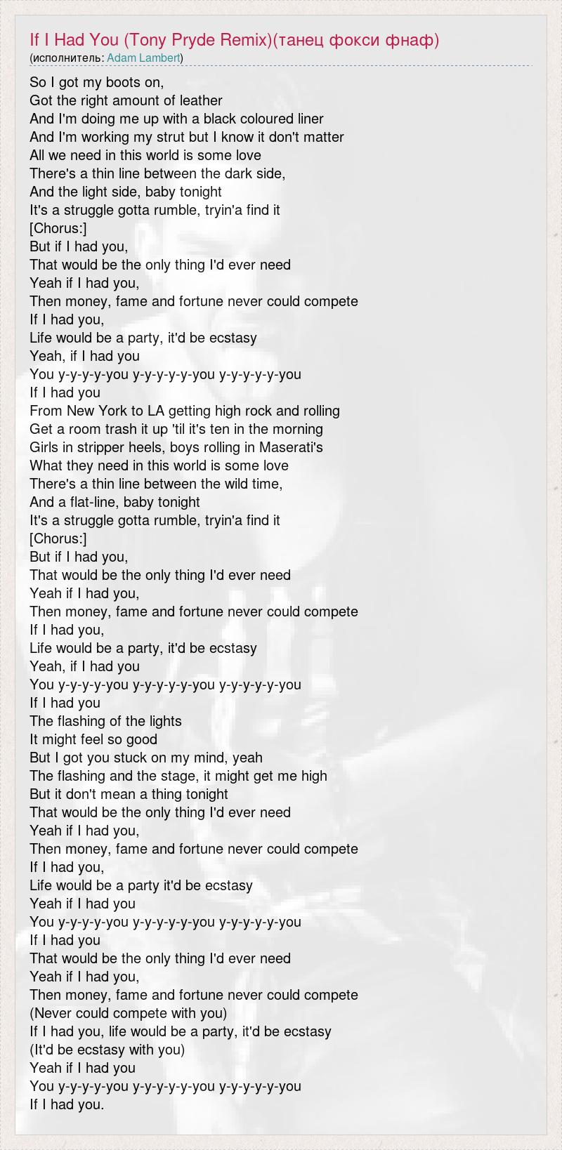 So I got my boots on, Got the right amount of leather And I'm doing me up with a black coloured liner And I'm working my strut but I know it don't matter All we need in this world is some love There's a thin line between the dark side, And the light side, baby tonight It's a struggle gotta rumble, tryin'a find it [Chorus:] But if I had you, That would be the only thing I'd ever need Yeah if I had you, Then money, fame and fortune never could compete If I had you, Life would be a party, it'd be ecstasy Yeah, if I had you You y-y-y-y-you y-y-y-y-y-you y-y-y-y-y-you If I had you From New York to LA getting high rock and rolling Get a room trash it up 'til it's ten in the morning Girls in stripper heels, boys rolling in Maserati's What they need in this world is some love There's a thin line between the wild time, And a flat-line, baby tonight It's a struggle gotta rumble, tryin'a find it [Chorus:] But if I had you, That would be the only thing I'd ever need Yeah if I had you, Then money, fame and fortune never could compete If I had you, Life would be a party, it'd be ecstasy Yeah, if I had you You y-y-y-y-you y-y-y-y-y-you y-y-y-y-y-you If I had you The flashing of the lights It might feel so good But I got you stuck on my mind, yeah The flashing and the stage, it might get me high But it don't mean a thing tonight That would be the only thing I'd ever need Yeah if I had you, Then money, fame and fortune never could compete If I had you, Life would be a party it'd be ecstasy Yeah if I had you You y-y-y-y-you y-y-y-y-y-you y-y-y-y-y-you If I had you That would be the only thing I'd ever need Yeah if I had you, Then money, fame and fortune never could compete (Never could compete with you) If I had you, life would be a party, it'd be ecstasy (It'd be ecstasy with you) Yeah if I had you You y-y-y-y-you y-y-y-y-y-you y-y-y-y-y-you If I had you.