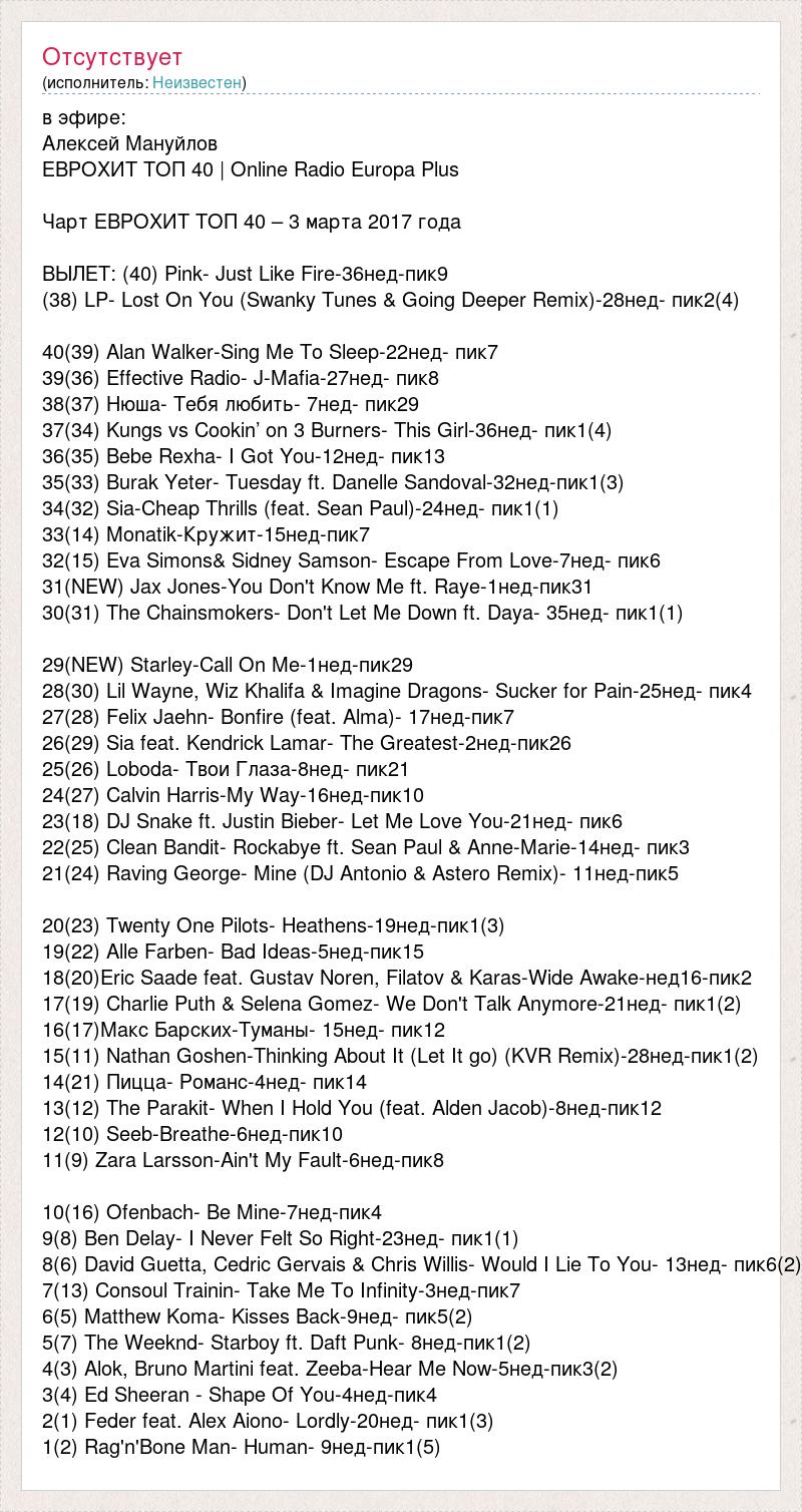 в эфире: Алексей Мануйлов ЕВРОХИТ ТОП 40 | Online Radio Europa Plus Чарт ЕВРОХИТ ТОП 40 – 3 марта 2017 года ВЫЛЕТ: (40) Pink- Just Like Fire-36нед-пик9 (38) LP- Lost On You (Swanky Tunes & Going Deeper Remix)-28нед- пик2(4) 40(39) Alan Walker-Sing Me To Sleep-22нед- пик7 39(36) Effective Radio- J-Mafia-27нед- пик8 38(37) Нюша- Тебя любить- 7нед- пик29 37(34) Kungs vs Cookin’ on 3 Burners- This Girl-36нед- пик1(4) 36(35) Bebe Rexha- I Got You-12нед- пик13 35(33) Burak Yeter- Tuesday ft. Danelle Sandoval-32нед-пик1(3) 34(32) Sia-Cheap Thrills (feat. Sean Paul)-24нед- пик1(1) 33(14) Monatik-Кружит-15нед-пик7 32(15) Eva Simons& Sidney Samson- Escape From Love-7нед- пик6 31(NEW) Jax Jones-You Don't Know Me ft. Raye-1нед-пик31 30(31) The Chainsmokers- Don't Let Me Down ft. Daya- 35нед- пик1(1) 29(NEW) Starley-Call On Me-1нед-пик29 28(30) Lil Wayne, Wiz Khalifa & Imagine Dragons- Sucker for Pain-25нед- пик4 27(28) Felix Jaehn- Bonfire (feat. Alma)- 17нед-пик7 26(29) Sia feat. Kendrick Lamar- The Greatest-2нед-пик26 25(26) Loboda- Твои Глаза-8нед- пик21 24(27) Calvin Harris-My Way-16нед-пик10 23(18) DJ Snake ft. Justin Bieber- Let Me Love You-21нед- пик6 22(25) Clean Bandit- Rockabye ft. Sean Paul & Anne-Marie-14нед- пик3 21(24) Raving George- Mine (DJ Antonio & Astero Remix)- 11нед-пик5 20(23) Twenty One Pilots- Heathens-19нед-пик1(3) 19(22) Alle Farben- Bad Ideas-5нед-пик15 18(20)Eric Saade feat. Gustav Noren, Filatov & Karas-Wide Awake-нед16-пик2 17(19) Charlie Puth & Selena Gomez- We Don't Talk Anymore-21нед- пик1(2) 16(17)Макс Барских-Туманы- 15нед- пик12 15(11) Nathan Goshen-Thinking About It (Let It go) (KVR Remix)-28нед-пик1(2) 14(21) Пицца- Романс-4нед- пик14 13(12) The Parakit- When I Hold You (feat. Alden Jacob)-8нед-пик12 12(10) Seeb-Breathe-6нед-пик10 11(9) Zara Larsson-Ain't My Fault-6нед-пик8 10(16) Ofenbach- Be Mine-7нед-пик4 9(8) Ben Delay- I Never Felt So Right-23нед- пик1(1) 8(6) David Guetta, Cedric Gervais & Chris Willis- Would I Lie To You- 13нед- пик6(2) 7(13) Consoul Trainin- Take Me To Infinity-3нед-пик7 6(5) Matthew Koma- Kisses Back-9нед- пик5(2) 5(7) The Weeknd- Starboy ft. Daft Punk- 8нед-пик1(2) 4(3) Alok, Bruno Martini feat. Zeeba-Hear Me Now-5нед-пик3(2) 3(4) Ed Sheeran - Shape Of You-4нед-пик4 2(1) Feder feat. Alex Aiono- Lordly-20нед- пик1(3) 1(2) Rag'n'Bone Man- Human- 9нед-пик1(5)