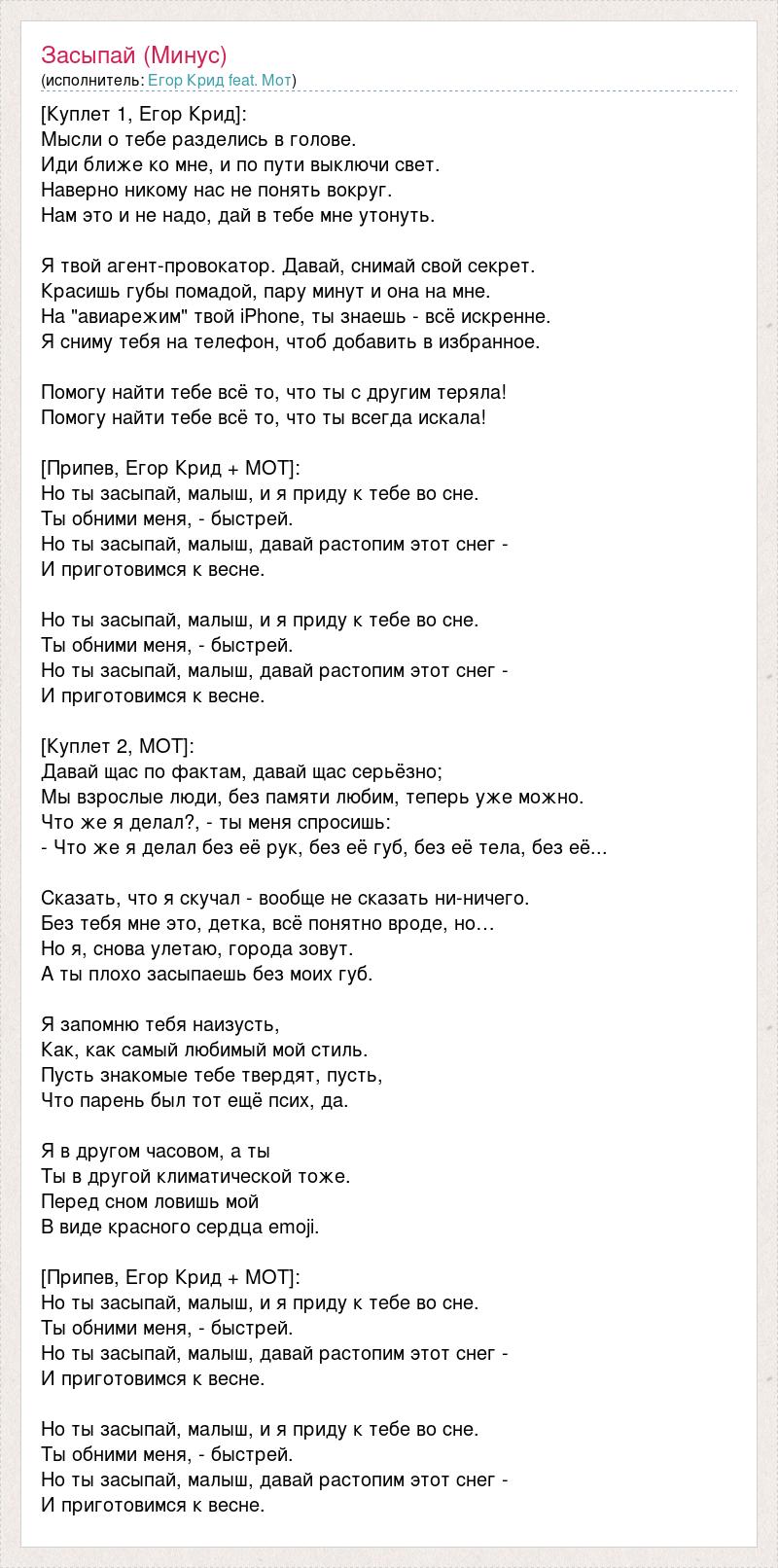 [Куплет 1, Егор Крид]: Мысли о тебе разделись в голове. Иди ближе ко мне, и по пути выключи свет. Наверно никому нас не понять вокруг. Нам это и не надо, дай в тебе мне утонуть. Я твой агент-провокатор. Давай, снимай свой секрет. Красишь губы помадой, пару минут и она на мне. На "авиарежим" твой iPhone, ты знаешь - всё искренне. Я сниму тебя на телефон, чтоб добавить в избранное. Помогу найти тебе всё то, что ты с другим теряла! Помогу найти тебе всё то, что ты всегда искала! [Припев, Егор Крид + МОТ]: Но ты засыпай, малыш, и я приду к тебе во сне. Ты обними меня, - быстрей. Но ты засыпай, малыш, давай растопим этот снег - И приготовимся к весне. Но ты засыпай, малыш, и я приду к тебе во сне. Ты обними меня, - быстрей. Но ты засыпай, малыш, давай растопим этот снег - И приготовимся к весне. [Куплет 2, МОТ]: Давай щас по фактам, давай щас серьёзно; Мы взрослые люди, без памяти любим, теперь уже можно. Что же я делал?, - ты меня спросишь: - Что же я делал без её рук, без её губ, без её тела, без её... Сказать, что я скучал - вообще не сказать ни-ничего. Без тебя мне это, детка, всё понятно вроде, но… Но я, снова улетаю, города зовут. А ты плохо засыпаешь без моих губ. Я запомню тебя наизусть, Как, как самый любимый мой стиль. Пусть знакомые тебе твердят, пусть, Что парень был тот ещё псих, да. Я в другом часовом, а ты Ты в другой климатической тоже. Перед сном ловишь мой В виде красного сердца emoji. [Припев, Егор Крид + МОТ]: Но ты засыпай, малыш, и я приду к тебе во сне. Ты обними меня, - быстрей. Но ты засыпай, малыш, давай растопим этот снег - И приготовимся к весне. Но ты засыпай, малыш, и я приду к тебе во сне. Ты обними меня, - быстрей. Но ты засыпай, малыш, давай растопим этот снег - И приготовимся к весне.