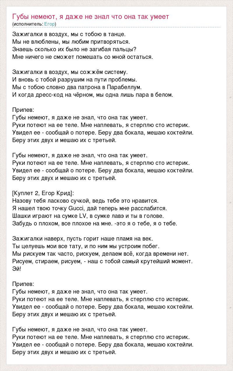 Зажигалки в воздух, мы с тобою в танце. Мы не влюблены, мы любим притворяться. Знаешь сколько их было не загибая пальцы? Мне ничего не сможет помешать со мной остаться. Зажигалки в воздух, мы сожжём систему. И вновь с тобой разрушим на пути проблемы. Мы с тобою словно два патрона в Парабеллум. И когда дресс-код на чёрном, мы одна лишь пара в белом. Припев: Губы немеют, я даже не знал, что она так умеет. Руки потеют на ее теле. Мне наплевать, я стерплю сто истерик. Увидел ее - сообщай о потере. Беру два бокала, мешаю коктейли. Беру этих двух и мешаю их с третьей. Губы немеют, я даже не знал, что она так умеет. Руки потеют на ее теле. Мне наплевать, я стерплю сто истерик. Увидел ее - сообщай о потере. Беру два бокала, мешаю коктейли. Беру этих двух и мешаю их с третьей. [Куплет 2, Егор Крид]: Назову тебя ласково сучкой, ведь тебе это нравится. Я нашел твою точку Gucci, дай теперь мне расслабится. Шашки играют на сумке LV, в сумке лавэ и ты в голове. Забудь о плохом, все плохое на мне. -это я о тебе, я о тебе. Зажигалки наверх, пусть горит наше пламя на век. Ты целуешь мои все тату, и по ним мы устроим побег. Мы рискуем так часто, рискуем, делаем всё, когда времени нет. Рисуем, стираем, рисуем, - наш с тобой самый крутейший момент. Эй! Припев: Губы немеют, я даже не знал, что она так умеет. Руки потеют на ее теле. Мне наплевать, я стерплю сто истерик. Увидел ее - сообщай о потере. Беру два бокала, мешаю коктейли. Беру этих двух и мешаю их с третьей. Губы немеют, я даже не знал, что она так умеет. Руки потеют на ее теле. Мне наплевать, я стерплю сто истерик. Увидел ее - сообщай о потере. Беру два бокала, мешаю коктейли. Беру этих двух и мешаю их с третьей.
