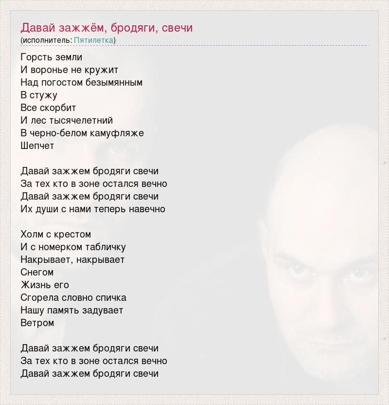 Горсть земли И воронье не кружит Над погостом безымянным В стужу Все скорбит И лес тысячелетний В черно-белом камуфляже Шепчет Давай зажжем бродяги свечи За тех кто в зоне остался вечно Давай зажжем бродяги свечи Их души с нами теперь навечно Холм с крестом И с номерком табличку Накрывает, накрывает Снегом Жизнь его Сгорела словно спичка Нашу память задувает Ветром Давай зажжем бродяги свечи За тех кто в зоне остался вечно Давай зажжем бродяги свечи