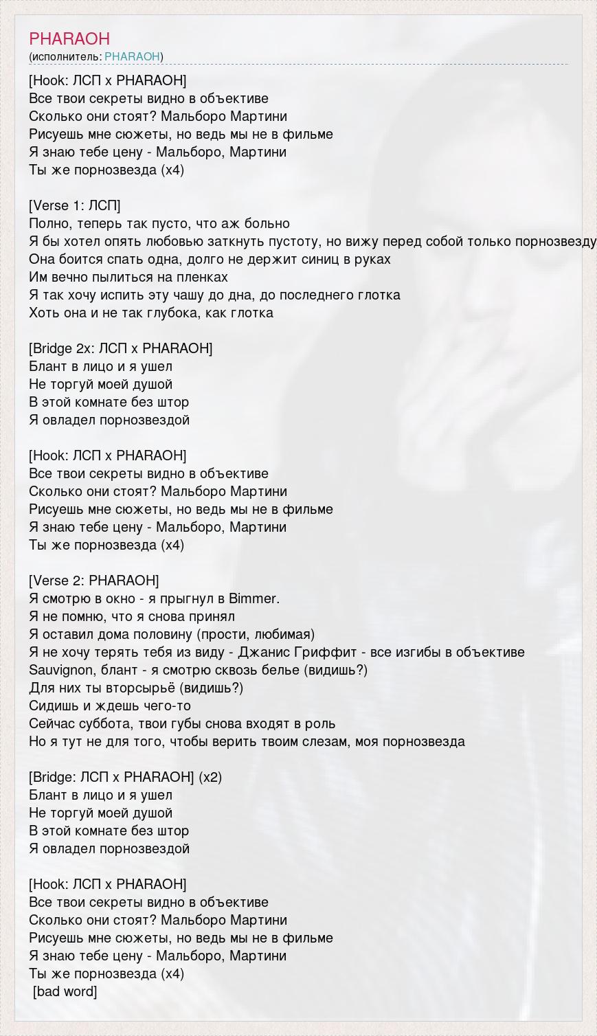 [Hook: ЛСП х PHARAOH] Все твои секреты видно в объективе Сколько они стоят? Мальборо Мартини Рисуешь мне сюжеты, но ведь мы не в фильме Я знаю тебе цену - Мальборо, Мартини Ты же порнозвезда (х4) [Verse 1: ЛСП] Полно, теперь так пусто, что аж больно Я бы хотел опять любовью заткнуть пустоту, но вижу перед собой только порнозвезду Она боится спать одна, долго не держит синиц в руках Им вечно пылиться на пленках Я так хочу испить эту чашу до дна, до последнего глотка Хоть она и не так глубока, как глотка [Bridge 2x: ЛСП x PHARAOH] Блант в лицо и я ушел Не торгуй моей душой В этой комнате без штор Я овладел порнозвездой [Hook: ЛСП х PHARAOH] Все твои секреты видно в объективе Сколько они стоят? Мальборо Мартини Рисуешь мне сюжеты, но ведь мы не в фильме Я знаю тебе цену - Мальборо, Мартини Ты же порнозвезда (х4) [Verse 2: PHARAOH] Я смотрю в окно - я прыгнул в Bimmer. Я не помню, что я снова принял Я оставил дома половину (прости, любимая) Я не хочу терять тебя из виду - Джанис Гриффит - все изгибы в объективе Sauvignon, блант - я смотрю сквозь белье (видишь?) Для них ты вторсырьё (видишь?) Сидишь и ждешь чего-то Сейчас суббота, твои губы снова входят в роль Но я тут не для того, чтобы верить твоим слезам, моя порнозвезда [Bridge: ЛСП x PHARAOH] (x2) Блант в лицо и я ушел Не торгуй моей душой В этой комнате без штор Я овладел порнозвездой [Hook: ЛСП х PHARAOH] Все твои секреты видно в объективе Сколько они стоят? Мальборо Мартини Рисуешь мне сюжеты, но ведь мы не в фильме Я знаю тебе цену - Мальборо, Мартини Ты же порнозвезда (х4) [bad word]