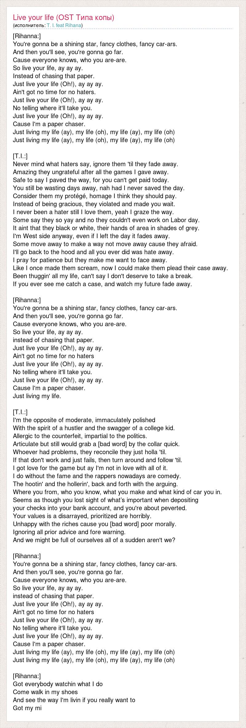 [Rihanna:] You're gonna be a shining star, fancy clothes, fancy car-ars. And then you'll see, you're gonna go far. Cause everyone knows, who you are-are. So live your life, ay ay ay. Instead of chasing that paper. Just live your life (Oh!), ay ay ay. Ain't got no time for no haters. Just live your life (Oh!), ay ay ay. No telling where it'll take you. Just live your life (Oh!), ay ay ay. Cause I'm a paper chaser. Just living my life (ay), my life (oh), my life (ay), my life (oh) Just living my life (ay), my life (oh), my life (ay), my life (oh) [T.I.:] Never mind what haters say, ignore them 'til they fade away. Amazing they ungrateful after all the games I gave away. Safe to say I paved the way, for you can't get paid today. You still be wasting days away, nah had I never saved the day. Consider them my protégé, homage I think they should pay. Instead of being gracious, they violated and made you wait. I never been a hater still I love them, yeah I graze the way. Some say they so yay and no they couldn't even work on Labor day. It aint that they black or white, their hands of area in shades of grey. I'm West side anyway, even if I left the day it fades away. Some move away to make a way not move away cause they afraid. I'll go back to the hood and all you ever did was hate away. I pray for patience but they make me want to face away. Like I once made them scream, now I could make them plead their case away. Been thuggin' all my life, can't say I don't deserve to take a break. If you ever see me catch a case, and watch my future fade away. [Rihanna:] You're gonna be a shining star, fancy clothes, fancy car-ars. And then you'll see, you're gonna go far. Cause everyone knows, who you are-are. So live your life, ay ay ay. instead of chasing that paper. Just live your life (Oh!), ay ay ay. Ain't got no time for no haters Just live your life (Oh!), ay ay ay. No telling where it'll take you. Just live your life (Oh!), ay ay ay. Cause I'm a paper chaser. Just living my life. [T.I.:] I'm the opposite of moderate, immaculately polished With the spirit of a hustler and the swagger of a college kid. Allergic to the counterfeit, impartial to the politics. Articulate but still would grab a [bad word] by the collar quick. Whoever had problems, they reconcile they just holla 'til. If that don't work and just fails, then turn around and follow 'til. I got love for the game but ay I'm not in love with all of it. I do without the fame and the rappers nowadays are comedy. The hootin' and the hollerin', back and forth with the arguing. Where you from, who you know, what you make and what kind of car you in. Seems as though you lost sight of what’s important when depositing your checks into your bank account, and you're about peverted. Your values is a disarrayed, prioritized are horribly. Unhappy with the riches cause you [bad word] poor morally. Ignoring all prior advice and fore warning. And we might be full of ourselves all of a sudden aren't we? [Rihanna:] You're gonna be a shining star, fancy clothes, fancy car-ars. And then you'll see, you're gonna go far. Cause everyone knows, who you are-are. So live your life, ay ay ay. instead of chasing that paper. Just live your life (Oh!), ay ay ay. Ain't got no time for no haters Just live your life (Oh!), ay ay ay. No telling where it'll take you. Just live your life (Oh!), ay ay ay. Cause I'm a paper chaser. Just living my life (ay), my life (oh), my life (ay), my life (oh) Just living my life (ay), my life (oh), my life (ay), my life (oh) [Rihanna:] Got everybody watchin what I do Come walk in my shoes And see the way I'm livin if you really want to Got my mi