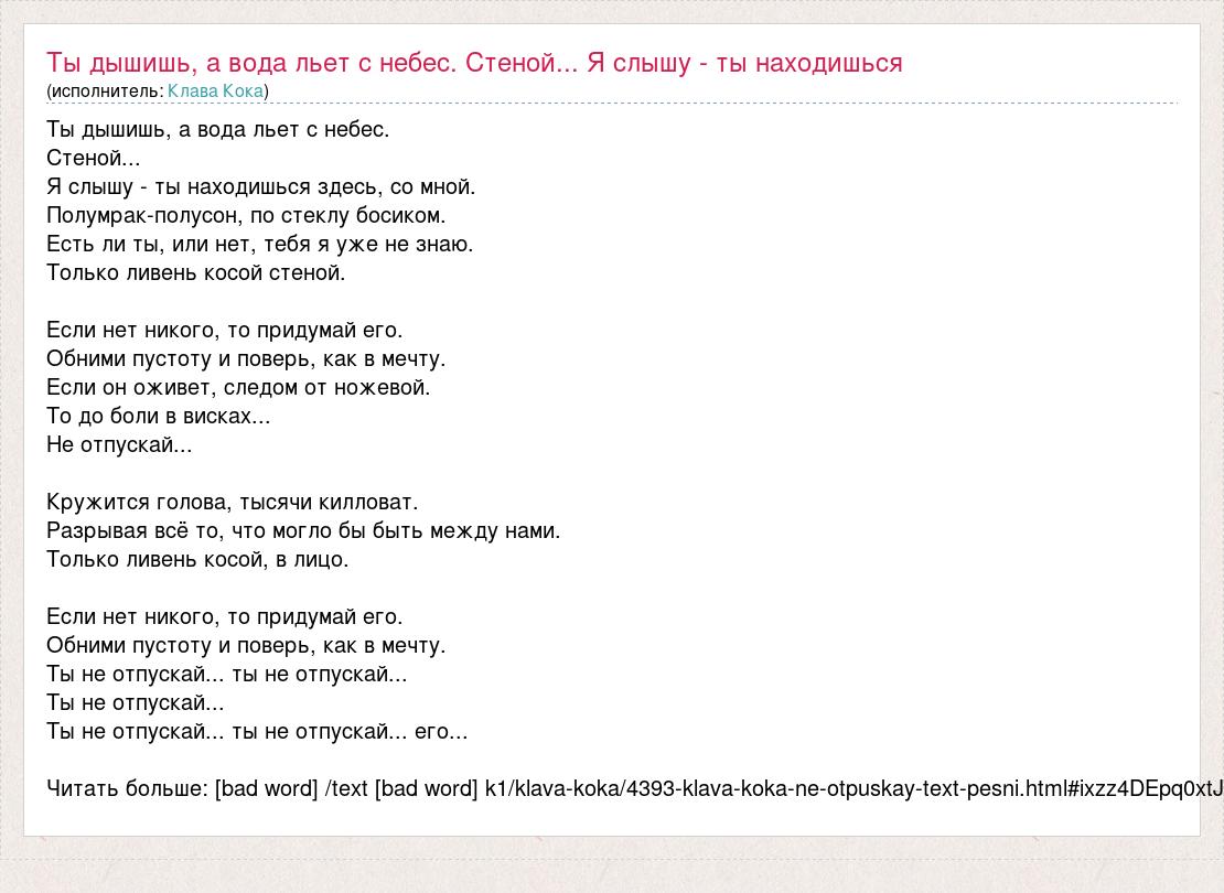 Ты дышишь, а вода льет с небес. Стеной... Я слышу - ты находишься здесь, со мной. Полумрак-полусон, по стеклу босиком. Есть ли ты, или нет, тебя я уже не знаю. Только ливень косой стеной. Если нет никого, то придумай его. Обними пустоту и поверь, как в мечту. Если он оживет, следом от ножевой. То до боли в висках... Не отпускай... Кружится голова, тысячи килловат. Разрывая всё то, что могло бы быть между нами. Только ливень косой, в лицо. Если нет никого, то придумай его. Обними пустоту и поверь, как в мечту. Ты не отпускай... ты не отпускай... Ты не отпускай... Ты не отпускай... ты не отпускай... его... Читать больше: [bad word] /text [bad word] k1/klava-koka/4393-klava-koka-ne-otpuskay-text-pesni.html#ixzz4DEpq0xtJ