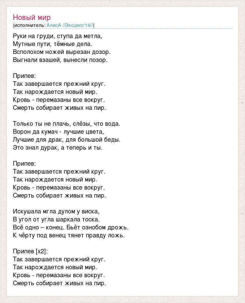 Руки на груди, ступа да метла, Мутные пути, тёмные дела. Всполохом ножей вырезан дозор. Выгнали взашей, вынесли позор. Припев: Так завершается прежний круг. Так нарождается новый мир. Кровь - перемазаны все вокруг. Смерть собирает живых на пир. Только ты не плачь, слёзы, что вода. Ворон да кумач - лучшие цвета, Лучшие для драк, для большой беды. Это знал дурак, а теперь и ты. Припев: Так завершается прежний круг. Так нарождается новый мир. Кровь - перемазаны все вокруг. Смерть собирает живых на пир. Искушала мгла дулом у виска, В угол от угла шаркала тоска. Всё одно – конец. Бьёт ознобом дрожь. К чёрту под венец тянет правду ложь. Припев [x2]: Так завершается прежний круг. Так нарождается новый мир. Кровь - перемазаны все вокруг. Смерть собирает живых на пир.