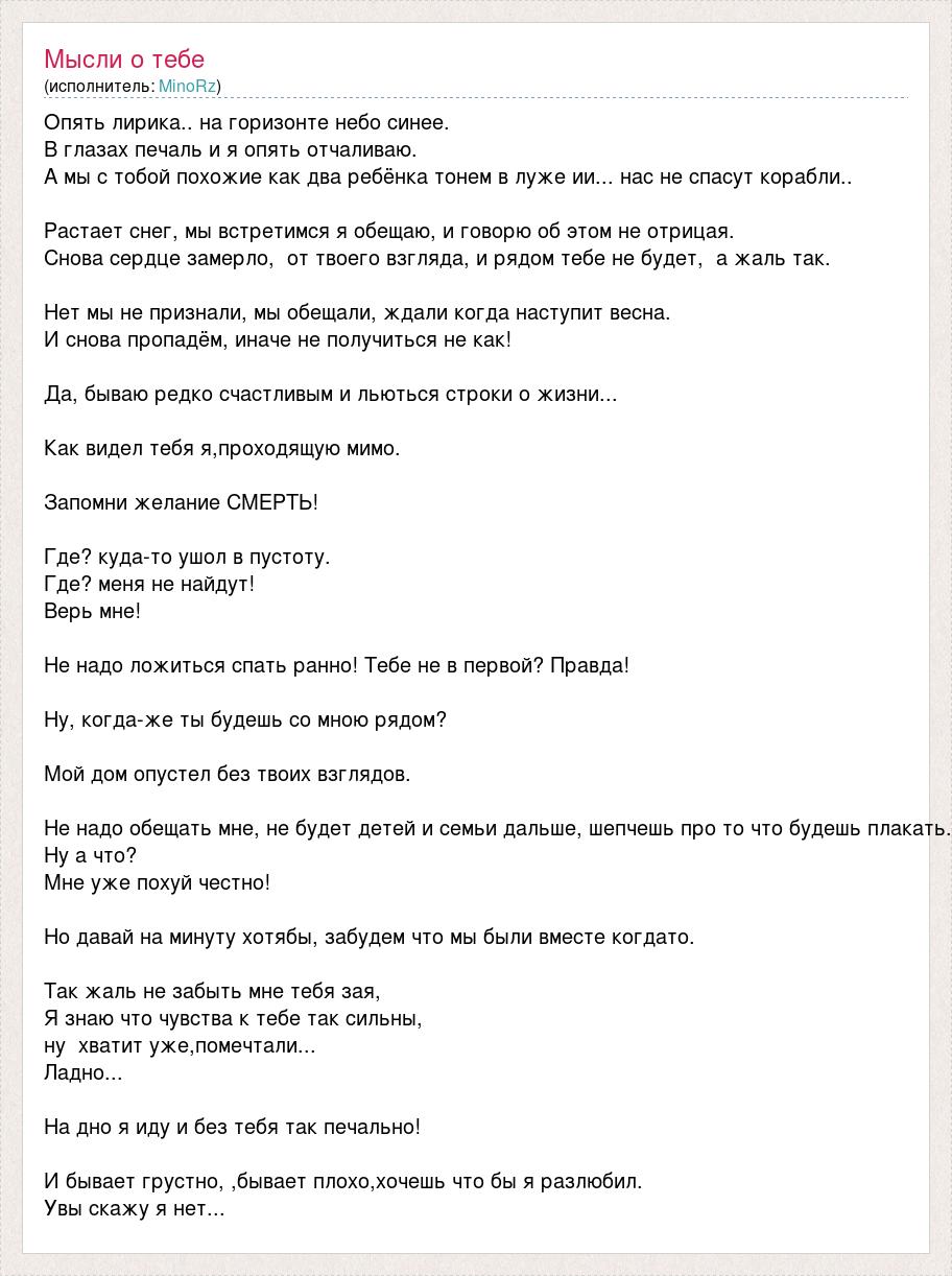 Опять лирика.. на горизонте небо синее. В глазах печаль и я опять отчаливаю. А мы с тобой похожие как два ребёнка тонем в луже ии... нас не спасут корабли.. Растает снег, мы встретимся я обещаю, и говорю об этом не отрицая. Снова сердце замерло, от твоего взгляда, и рядом тебе не будет, а жаль так. Нет мы не признали, мы обещали, ждали когда наступит весна. И снова пропадём, иначе не получиться не как! Да, бываю редко счастливым и льються строки о жизни... Как видел тебя я,проходящую мимо. Запомни желание СМЕРТЬ! Где? куда-то ушол в пустоту. Где? меня не найдут! Верь мне! Не надо ложиться спать ранно! Тебе не в первой? Правда! Ну, когда-же ты будешь со мною рядом? Мой дом опустел без твоих взглядов. Не надо обещать мне, не будет детей и семьи дальше, шепчешь про то что будешь плакать. Ну а что? Мне уже похуй честно! Но давай на минуту хотябы, забудем что мы были вместе когдато. Так жаль не забыть мне тебя зая, Я знаю что чувства к тебе так сильны, ну хватит уже,помечтали... Ладно... На дно я иду и без тебя так печально! И бывает грустно, ,бывает плохо,хочешь что бы я разлюбил. Увы скажу я нет...