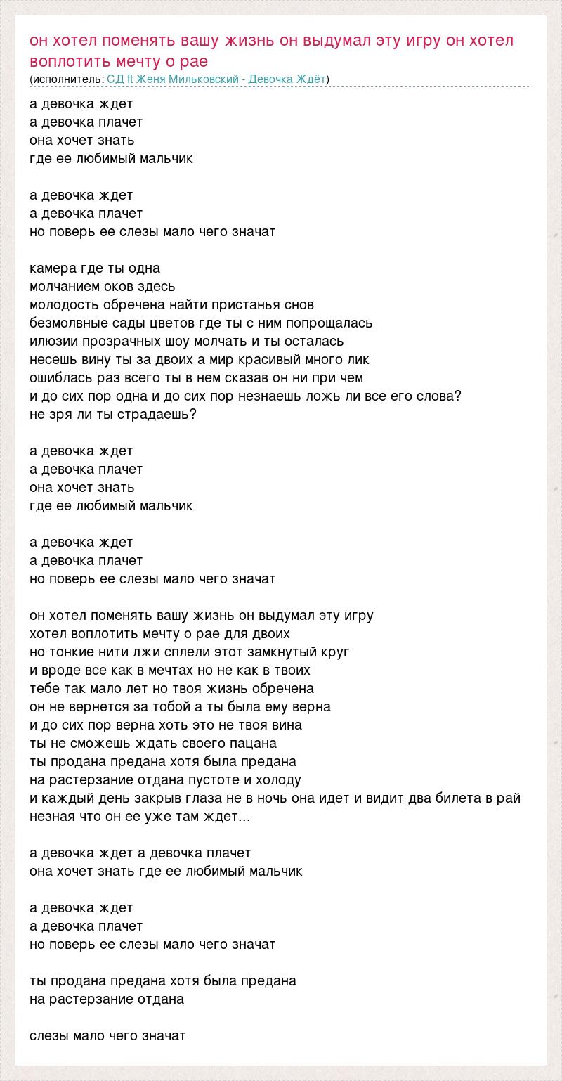 а девочка ждет а девочка плачет она хочет знать где ее любимый мальчик а девочка ждет а девочка плачет но поверь ее слезы мало чего значат камера где ты одна молчанием оков здесь молодость обречена найти пристанья снов безмолвные сады цветов где ты с ним попрощалась илюзии прозрачных шоу молчать и ты осталась несешь вину ты за двоих а мир красивый много лик ошиблась раз всего ты в нем сказав он ни при чем и до сих пор одна и до сих пор незнаешь ложь ли все его слова? не зря ли ты страдаешь? а девочка ждет а девочка плачет она хочет знать где ее любимый мальчик а девочка ждет а девочка плачет но поверь ее слезы мало чего значат он хотел поменять вашу жизнь он выдумал эту игру хотел воплотить мечту о рае для двоих но тонкие нити лжи сплели этот замкнутый круг и вроде все как в мечтах но не как в твоих тебе так мало лет но твоя жизнь обречена он не вернется за тобой а ты была ему верна и до сих пор верна хоть это не твоя вина ты не сможешь ждать своего пацана ты продана предана хотя была предана на растерзание отдана пустоте и холоду и каждый день закрыв глаза не в ночь она идет и видит два билета в рай незная что он ее уже там ждет... а девочка ждет а девочка плачет она хочет знать где ее любимый мальчик а девочка ждет а девочка плачет но поверь ее слезы мало чего значат ты продана предана хотя была предана на растерзание отдана слезы мало чего значат