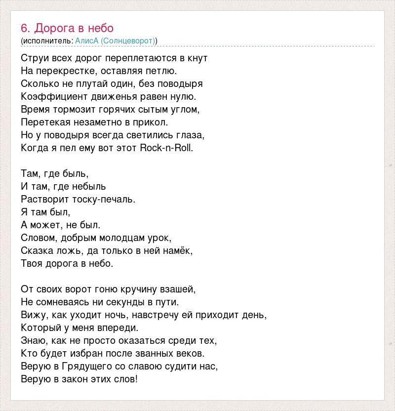 Струи всех дорог переплетаются в кнут На перекрестке, оставляя петлю. Сколько не плутай один, без поводыря Коэффициент движенья равен нулю. Время тормозит горячих сытым углом, Перетекая незаметно в прикол. Но у поводыря всегда светились глаза, Когда я пел ему вот этот Rock-n-Roll. Там, где быль, И там, где небыль Растворит тоску-печаль. Я там был, А может, не был. Словом, добрым молодцам урок, Сказка ложь, да только в ней намёк, Твоя дорога в небо. От своих ворот гоню кручину взашей, Не сомневаясь ни секунды в пути. Вижу, как уходит ночь, навстречу ей приходит день, Который у меня впереди. Знаю, как не просто оказаться среди тех, Кто будет избран после званных веков. Верую в Грядущего со славою судити нас, Верую в закон этих слов!