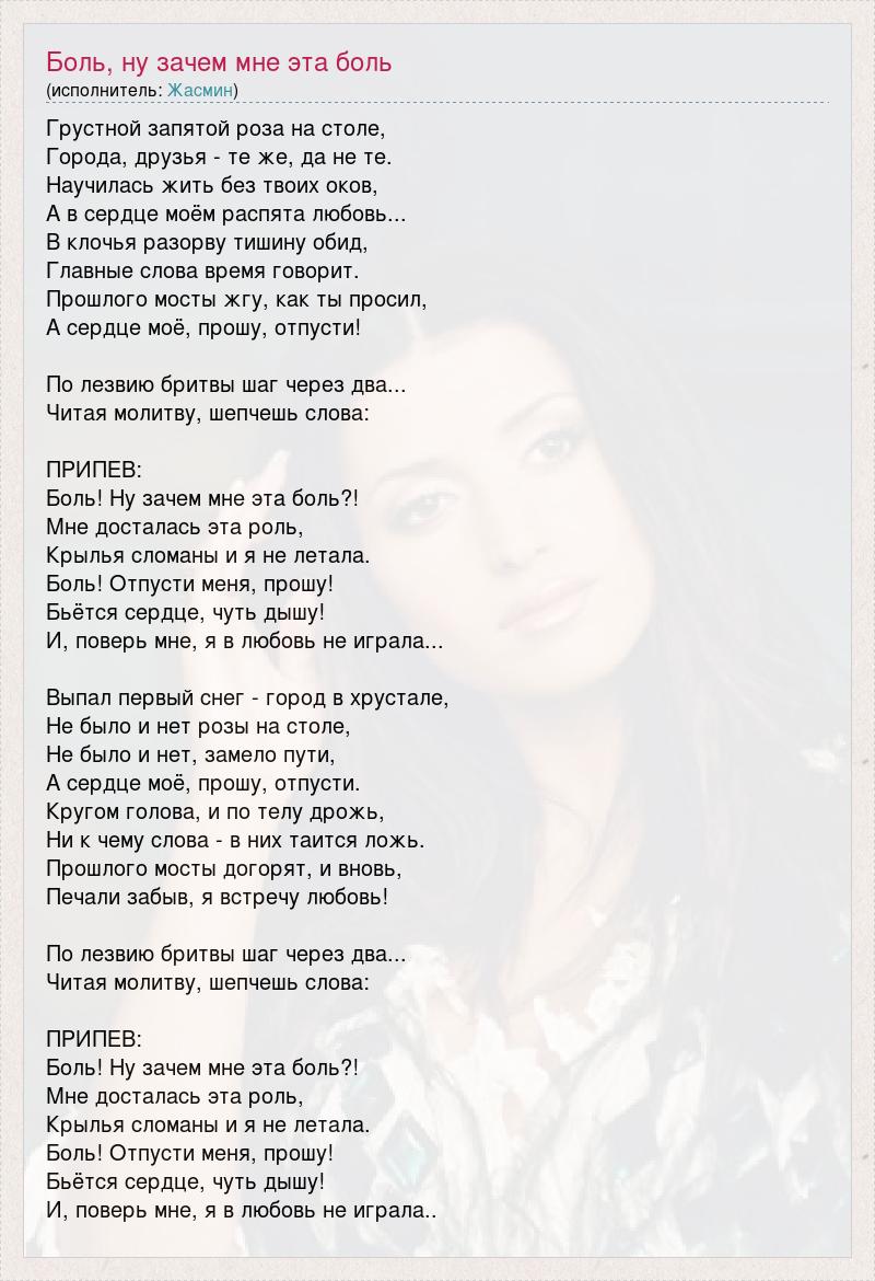 Грустной запятой роза на столе, Города, друзья - те же, да не те. Научилась жить без твоих оков, А в сердце моём распята любовь... В клочья разорву тишину обид, Главные слова время говорит. Прошлого мосты жгу, как ты просил, А сердце моё, прошу, отпусти! По лезвию бритвы шаг через два... Читая молитву, шепчешь слова: ПРИПЕВ: Боль! Ну зачем мне эта боль?! Мне досталась эта роль, Крылья сломаны и я не летала. Боль! Отпусти меня, прошу! Бьётся сердце, чуть дышу! И, поверь мне, я в любовь не играла... Выпал первый снег - город в хрустале, Не было и нет розы на столе, Не было и нет, замело пути, А сердце моё, прошу, отпусти. Кругом голова, и по телу дрожь, Ни к чему слова - в них таится ложь. Прошлого мосты догорят, и вновь, Печали забыв, я встречу любовь! По лезвию бритвы шаг через два... Читая молитву, шепчешь слова: ПРИПЕВ: Боль! Ну зачем мне эта боль?! Мне досталась эта роль, Крылья сломаны и я не летала. Боль! Отпусти меня, прошу! Бьётся сердце, чуть дышу! И, поверь мне, я в любовь не играла..