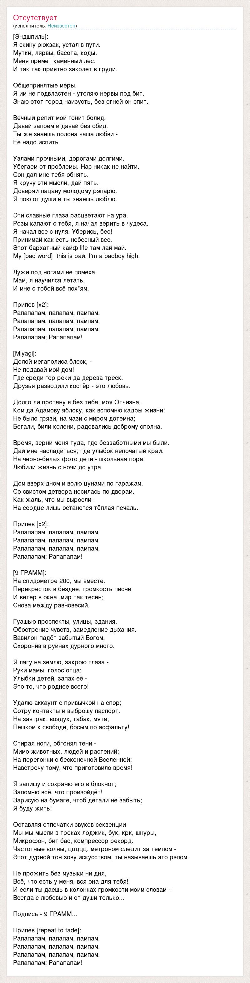 [Эндшпиль]: Я скину рюкзак, устал в пути. Мутки, лярвы, басота, коды. Меня примет каменный лес. И так так приятно заколет в груди. Общепринятые меры. Я им не подвластен - утоляю нервы под бит. Знаю этот город наизусть, без огней он спит. Вечный репит мой гонит болид. Давай запоем и давай без обид. Ты же знаешь полона чаша любви - Её надо испить. Узлами прочными, дорогами долгими. Убегаем от проблемы. Нас никак не найти. Сон дал мне тебя обнять. Я кручу эти мысли, дай пять. Доверяй пацану молодому рэпарю. Я пою от души и ты знаешь люблю. Эти славные глаза расцветают на ура. Розы капают с тебя, я начал верить в чудеса. Я начал все с нуля. Уберись, бес! Принимай как есть небесный вес. Этот бархатный кайф life там лай май. My [bad word] this is рай. I'm a badboy high. Лужи под ногами не помеха. Мам, я научился летать, И мне с тобой всё пох*ям. Припев [x2]: Рапапапам, папапам, пампам. Рапапапам, папапам, пампам. Рапапапам, папапам, пампам. Рапапапам; Рапапапам! [Miyagi]: Долой мегаполиса блеск, - Не подавай мой дом! Где среди гор реки да дерева треск. Друзья разводили костёр - это любовь. Долго ли протяну я без тебя, моя Отчизна. Ком да Адамову яблоку, как вспомню кадры жизни: Не было грязи, на мази с миром дотемна; Бегали, били колени, радовались доброму сполна. Время, верни меня туда, где беззаботными мы были. Дай мне насладиться; где улыбок непочатый край. На черно-белых фото дети - школьная пора. Любили жизнь с ночи до утра. Дом вверх дном и волю цунами по гаражам. Со свистом детвора носилась по дворам. Как жаль, что мы выросли - На сердце лишь останется тёплая печаль. Припев [x2]: Рапапапам, папапам, пампам. Рапапапам, папапам, пампам. Рапапапам, папапам, пампам. Рапапапам; Рапапапам! [9 ГРАММ]: На спидометре 200, мы вместе. Перекресток в бездне, громкость песни И ветер в окна, мир так тесен; Снова между равновесий. Гуашью проспекты, улицы, здания, Обострение чувств, замедление дыхания. Вавилон падёт забытый Богом, Схоронив в руинах дурного много. Я лягу на землю, закрою глаза - Руки мамы, голос отца; Улыбки детей, запах её - Это то, что роднее всего! Удалю аккаунт с привычкой на спор; Сотру контакты и выброшу паспорт. На завтрак: воздух, табак, мята; Пешком к свободе, босым по асфальту! Стирая ноги, обгоняя тени - Мимо животных, людей и растений; На перегонки с бесконечной Вселенной; Навстречу тому, что приготовило время! Я запишу и сохраню его в блокнот; Запомню всё, что произойдёт! Зарисую на бумаге, чтоб детали не забыть; Я буду жить! Оставляя отпечатки звуков секвенции Мы-мы-мысли в треках лоджик, бук, крк, шнуры, Микрофон, бит бас, компрессор рекорд. Частотные волны, ццццц, метроном следит за темпом - Этот дурной тон зову искусством, ты называешь это рэпом. Не прожить без музыки ни дня, Всё, что есть у меня, вся она для тебя! И если ты даешь в колонках громкости моим словам - Всегда с любовью и от души только... Подпись - 9 ГРАММ... Припев [repeat to fade]: Рапапапам, папапам, пампам. Рапапапам, папапам, пампам. Рапапапам, папапам, пампам. Рапапапам; Рапапапам!