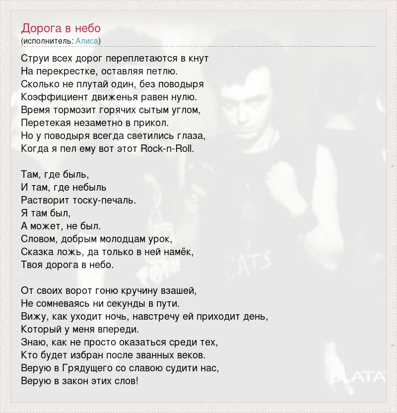 Струи всех дорог переплетаются в кнут На перекрестке, оставляя петлю. Сколько не плутай один, без поводыря Коэффициент движенья равен нулю. Время тормозит горячих сытым углом, Перетекая незаметно в прикол. Но у поводыря всегда светились глаза, Когда я пел ему вот этот Rock-n-Roll. Там, где быль, И там, где небыль Растворит тоску-печаль. Я там был, А может, не был. Словом, добрым молодцам урок, Сказка ложь, да только в ней намёк, Твоя дорога в небо. От своих ворот гоню кручину взашей, Не сомневаясь ни секунды в пути. Вижу, как уходит ночь, навстречу ей приходит день, Который у меня впереди. Знаю, как не просто оказаться среди тех, Кто будет избран после званных веков. Верую в Грядущего со славою судити нас, Верую в закон этих слов!
